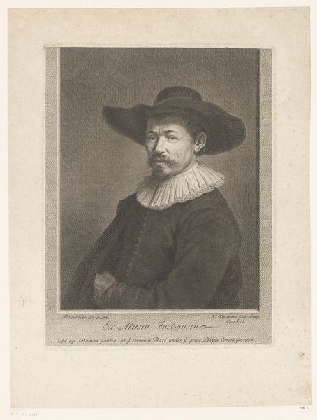 Editor: This is Reinier van Persijn's "Portret van Jan Pietersz. Douw," an engraving from the Dutch Golden Age, somewhere between 1623 and 1668. There's something really intense about his gaze that's kind of captivating. What's your interpretation of it? Curator: Well, portraits during the Dutch Golden Age weren't just about capturing a likeness; they were carefully constructed statements of identity and status. What strikes me is how the sitter, Jan Pietersz. Douw, presents himself, in relation to the rising merchant class during the period, and their desire to be seen as sophisticated intellectuals. Have you considered what that specific attire signals? Editor: The broad hat and the elaborate collar, definitely signifiers of wealth and perhaps an attempt at appearing dignified and intellectual. Curator: Exactly! This portrait participates in a dialogue about social mobility and self-fashioning, particularly for a man defined as a “genre-painting” character at the time. The almost stark contrast between the face and the background directs our focus. This creates an intensity which resonates even today. Considering the rigid class structures of the time, the image itself may have been a political statement about social mobility. How does the act of reproducing and circulating the image via engraving affect its impact? Editor: It democratizes the image to some degree, making it accessible to a broader audience beyond the elite, perhaps? Curator: Precisely. Engravings enabled wider access to art and ideas, potentially influencing how different social classes perceived themselves and others. In some ways it becomes its own meme. Editor: I never really thought about art from this period being so intertwined with identity and class politics. Thanks for showing me that deeper layer. Curator: It's always there. Engaging with art is more powerful once you start understanding what issues were at stake during the era.