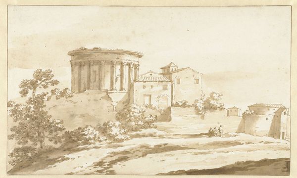 Editor: This is "Gezicht te Rome" – View of Rome – made between 1637 and 1689, by Jacob van der Ulft, rendered in ink and watercolor. It feels muted, almost dreamlike. The architecture is so present; how would you approach this work? Curator: Considering its materiality, look at the layered washes of ink and watercolor. How do these translucent materials work to represent, or rather, construct "Rome"? Ulft isn’t giving us an objective record, but a version, built through the application of pigment to paper. Editor: So you're suggesting the artwork's meaning lies in how it's physically created and what that says about the representation of Rome, as opposed to just what the image shows? Curator: Exactly. Think about the consumption of imagery in the 17th century. Travelers wanted souvenirs, portable versions of their experiences. Ulft’s workshop would have efficiently produced these views. Is this ‘high art,’ or a commodity responding to a demand? And consider the labour – who ground the pigments, prepared the paper? These “minor” tasks are intrinsic to the creation of the image. Editor: That definitely shifts my perspective! It connects the image to a whole economy. So, seeing this as a commodity – a product of artistic labour intended for consumption – what does that suggest about the artist's intent or the experience of owning such a work? Curator: The drawing is then less about *being* in Rome and more about *possessing* a version of Rome. What is the economic transaction embedded here? Also, how might the quick, repeatable nature of watercolor – ideal for rapid reproduction – democratize access to the image of Rome, beyond just wealthy elites? Editor: That's fascinating – I never would have considered the social and economic layers inherent in the creation of what appears to be a simple landscape drawing! Curator: Thinking through material processes opens up a wealth of interpretive possibilities. It encourages us to examine the how and why of artmaking, and the world in which art circulates.