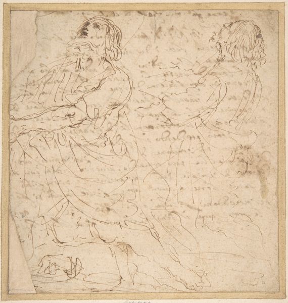 Guercino’s drawing "Man Stabbing Himself," rendered in pen and brown ink, presents us with a starkly lit figure poised in a dramatic act of self-violence. The composition is immediately striking: the figure dominates the space, with the focal point drawn to the hand gripping the dagger and the implied motion towards the torso. Guercino masterfully uses line weight to create depth, where the darker, more defined contours emphasize the tension and the gravity of the moment. The grid, visible beneath the sketch, provides a structural framework, yet the figure's dynamism disrupts this order, creating a sense of unease. This interplay between structure and disruption can be interpreted through a semiotic lens. The dagger, an archetypal signifier of both aggression and agency, becomes a complex symbol when turned inward. The act destabilizes the conventional understanding of the body as a boundary, challenging the fixed meanings associated with pain and control. Ultimately, the enduring power of this drawing resides in its formal qualities and its ability to invite ongoing interpretation about human nature.