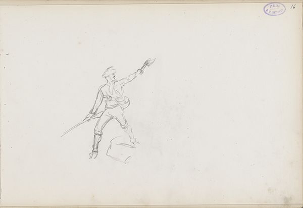 Editor: Right now, we're looking at "Soldaten met zwaarden, een bijl en een pijl en boog," or "Soldiers with swords, an axe, a bow and arrow." It’s a pencil drawing by George Hendrik Breitner, made in 1873. It has a sketch-like quality, quite sparse, almost dreamlike. What leaps out at you about this work? Curator: The raw energy, I think! It’s like Breitner’s captured a fleeting moment, a glimpse into some epic battle or legendary tale. And the roughness, that looseness, it practically breathes. Notice how he contrasts the stationary, almost sculptural quality of the soldiers on foot with the dynamic motion of the archer on horseback. Almost as if time is fluid. Do you see that, too? Editor: I do, especially the contrast in the medium— the shading on the horse makes the scene seem much more lively than the figures on the left. What would someone from the Romanticism movement have taken from it? Curator: They would see heroes! Look at the exaggerated musculature, the idealized forms. It’s a celebration of strength and courage, tinged with a hint of melancholy – like a memory of something grand that’s now lost. There's that fascination with the past that's typical in romanticism as well. It gives you a sense of nostalgia even when the specific image is vague. Editor: So, more about the *idea* of battle than a specific battle scene? Curator: Exactly! More a symbolic representation of valor than a literal depiction. Breitner wants you to *feel* the power of it, rather than understand every detail. That being said, I am intrigued with why there is such blank space on the page... a suggestion for another time, another place maybe. What would be beyond what we're seeing? Editor: It almost feels like Breitner wanted us to imagine the context for ourselves, with only the vaguest of information. This was extremely insightful. Thank you. Curator: The pleasure was mine. Thank you for prompting these thoughts - truly.
