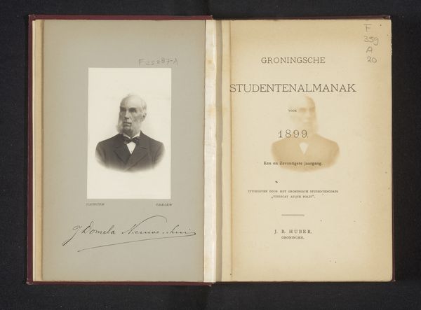 Curator: Here we have an albumen print titled "Portret van Sophia van Wurtemberg, koningin der Nederlanden" attributed to an anonymous artist, dating to before 1878. Editor: It's compelling. The portrait itself seems intimate, almost melancholic, positioned opposite what looks like a title page. Curator: Yes, the stark contrast is notable. The portrait of Queen Sophia is paired with the title page of the "Cadetten-Almanak" for 1878. Notice how her image, captured in a framed oval, almost floats on the page alongside meticulously printed text and the publisher's mark. The Almanak series indicates its material function and purpose beyond mere decoration or even a memorial. Editor: Absolutely. It feels very crafted. The quality of the albumen print process speaks to its own form of industrial labor but also how printing technologies were advancing and integrating with more specialized applications, here this cadet almanac of the time. And given this portrait has the description "deceased" on the same page... Curator: The juxtaposition with the fresh "Nieuwe Serie" banner highlights that duality sharply. One is caught in this play between life and remembrance, as suggested with Sophia’s name printed beneath, bookended with her birth and death dates. Her image functions as a memento mori, folded within this almanac. Editor: These Almanacs probably mass produced but what strikes me are these individual qualities brought by binding the photograph. A printed series meeting crafted touch is rare with these forms. I am drawn to considering the paper itself – aged, yet preserved, bearing witness to history in layers. Curator: Precisely, there’s something potent about how such a mass-produced item is imbued with personal significance through its presentation, reminding us how symbolic meaning is tied to tangible objects across various media of prints, writing, and photography itself. Editor: This print helps us trace materials circulating at this moment. How techniques influence its use, but also these affective layers imbue it. Fascinating! Curator: Indeed! The Cadetten-Almanak, framed around a single queen, provides not just context of craft, but captures enduring symbols interwoven with our own cultural narratives and memories.