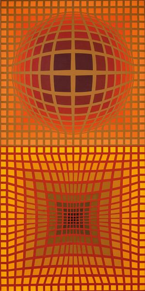 Victor Vasarely made "Tewe-ket" using clean, geometric shapes and bold colors that really pop. What strikes me first is how Vasarely plays with perception; the surface seems to ripple and shift, even though it’s completely flat. Looking closer, it’s all about the relationship between the squares and the lines – they bend and curve in a way that tricks your eye into seeing depth and volume. It’s not just about color; it’s about how the shapes interact, creating a sense of movement and vibration. That deep yellow-gold sphere at the bottom really stands out. The thick, black lines around that diamond shape in the middle make me think of a kind of futuristic target. Vasarely's work reminds me a bit of Bridget Riley’s, they both share that interest in how the eye and brain work together to make sense of what we see. Both artists invite us to question what's real and what's just a trick of the light. It’s all about the process of seeing, and how art can mess with our minds in the best possible way.