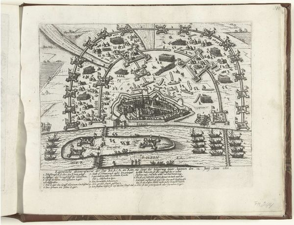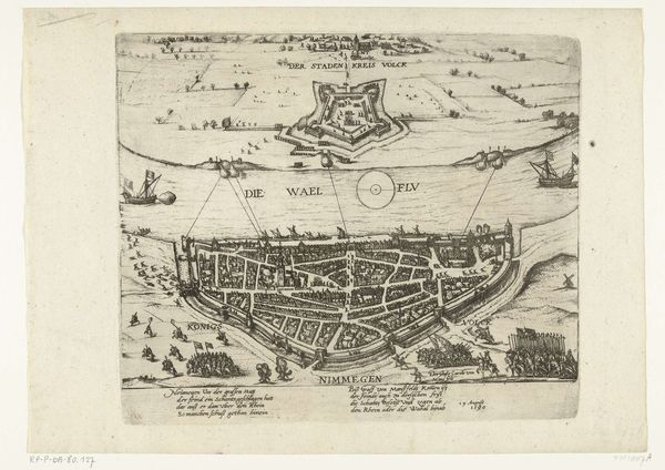 Curator: This print, dating from 1597 to 1599, presents "Beleg en verovering van Lingen, 1597," or, in English, "Siege and Conquest of Lingen, 1597." Although the maker is anonymous, it resides in the Rijksmuseum’s collection, created with ink and engraving techniques. Editor: My immediate impression is that it feels intensely organized, a precisely rendered overview where everything has its designated place. I like the visual density of the forms, especially the walls surrounding the town itself, all laid out. Curator: The work, characteristic of the Dutch Golden Age, isn't merely a cityscape, but a history painting as well. It illustrates the siege and capture of Lingen, a key event in the Dutch Revolt. This siege resonates deeply in Dutch cultural memory. Editor: Definitely! The composition emphasizes that feeling. Look at how the artist balances the representation of the city and its architectural structure with the disposition of forces surrounding it, utilizing semiotic relations to suggest domination. The line work contributes to an air of serious documentation, the calm eye of cartography applied to the tumult of war. Curator: Indeed. Notice how the symbols function: the orderly camps contrasted with the town, conveying not just a physical space, but also a psychological dynamic—the encroaching external forces versus the contained urban sphere, where fear and hope must have coexisted. This piece resonates even today because it depicts a city caught in the grips of historical transformation. Editor: Thinking of its aesthetic structure, I'm intrigued by the way the print manages to depict a bird's-eye view and yet, introduces ground-level perspective. It is breaking from simple reproduction and attempts an expressive form. It also contributes a sense of depth to what is otherwise a relatively flat picture plane. Curator: This capture of Lingen in 1597 holds deep meaning. We still find value in exploring the relationship between the city’s architectural symbolism and historical significance. Editor: Agreed. Analyzing its compositional techniques opens the piece to revealing expressive depths beyond that which simply meets the eye.