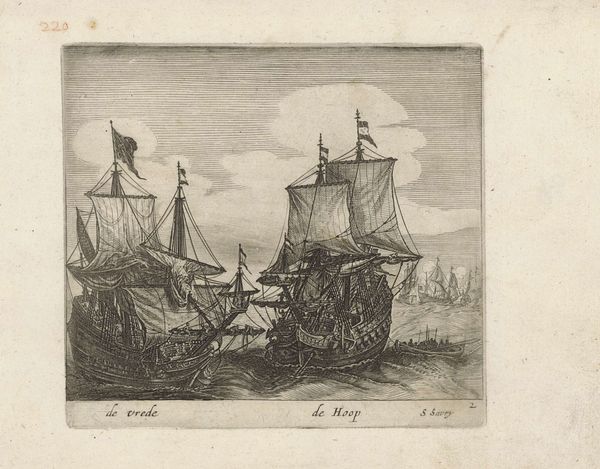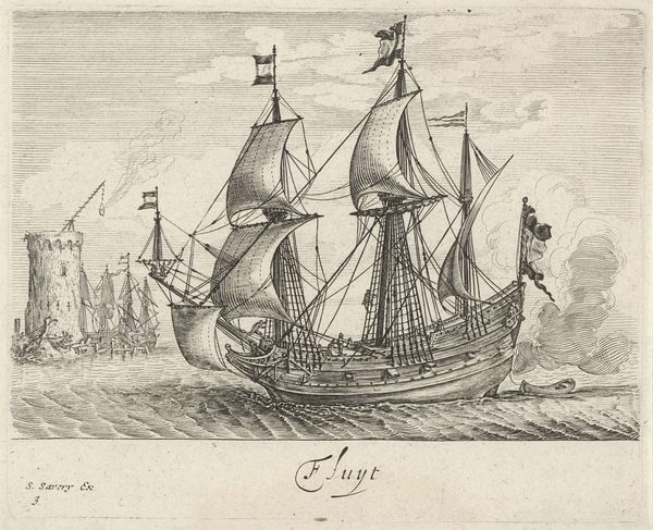 Editor: Here we have an etching from the Dutch Golden Age, dating from 1610 to 1665, "Zeilende driemaster met op de achtergrond een vuurtoren en zeilschepen"—"Sailing Three-Master with a Lighthouse and Sailing Ships in the Background," attributed to an anonymous artist, found at the Rijksmuseum. The detail is impressive. What can you tell me about it? Curator: The interesting thing to me is the etching itself. The labor involved, the tools used to create such precise lines that are mimicking something of importance for the Dutch economy, such as ships for transport. We have to ask, who was making this and what sort of market made such printmaking viable at the time? It wasn’t exactly cheap for most people, right? Editor: Right, it would have taken some degree of skill to make these, wouldn't it? Was this sort of etching common at the time? Curator: Precisely! This level of craftsmanship signifies the rise of specialized labor. Printmaking was booming as these images served multiple purposes, spreading visual information. Also, think about the socio-economic factors. Were they luxury items or increasingly accessible due to innovations in printmaking technologies, which could drive consumerism? Editor: That's a new way of considering this picture for me. Thinking about how widely images like this one were available, really shifts our view of who got to enjoy such scenes. Curator: Exactly! This artwork opens a window into understanding how consumer culture influenced the lives of the Dutch people during this era, challenging preconceived notions about fine art and common, everyday commodities.