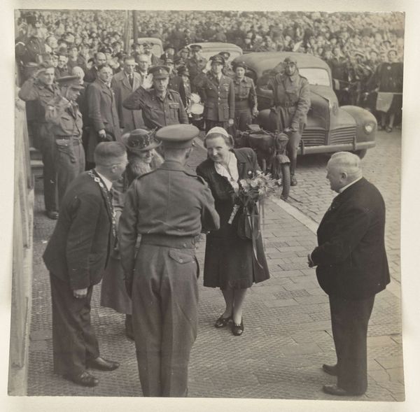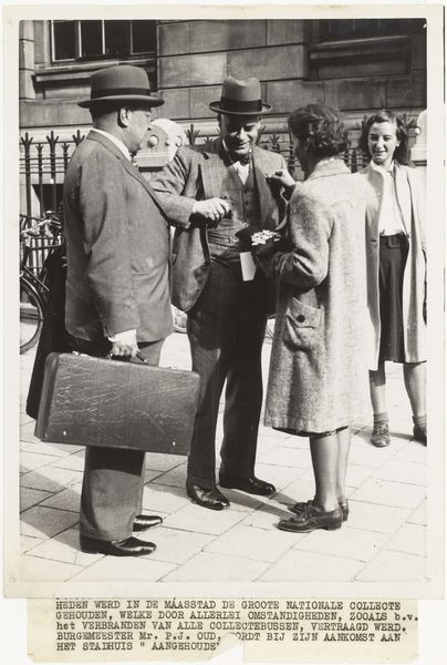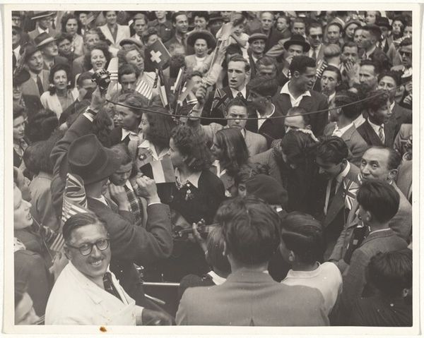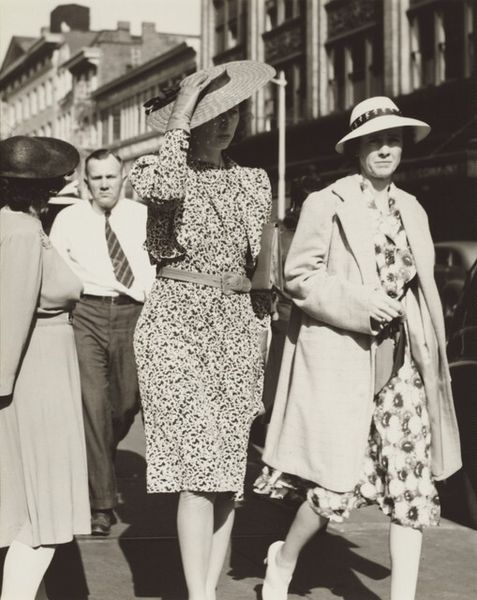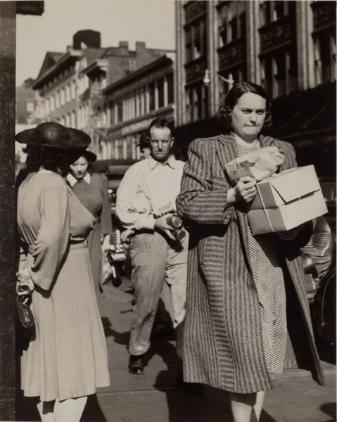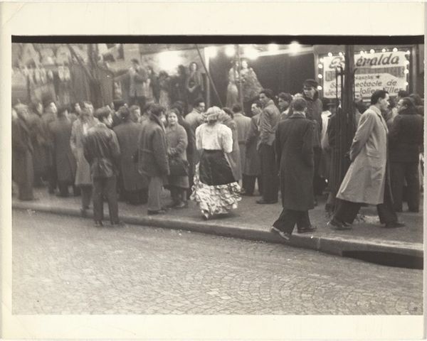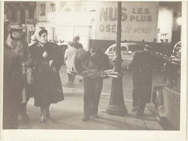 Curator: Robert Frank's gelatin silver print, "Avenue du Maine, Paris", taken between 1949 and 1950, offers a glimpse into postwar Parisian street life. Editor: Right off the bat, there's a feeling of profound waiting here, wouldn’t you agree? Almost feels as though this endless, nameless group is expecting a silent revolution. Curator: Absolutely. Frank, deeply affected by the war's impact on society, used his lens to capture this mood. He saw how political posters and advertisements attempted to revitalize France, often presenting an idealized image. But alongside these, stark realities persisted. Editor: He really seizes upon the ordinary to capture its unique poignancy, doesn't he? I can't quite put my finger on it, but the composition itself almost feels accidental... deliberately capturing that imperfection of life on the streets! Did you notice the fallen, possibly discarded, leg with a shoe in the very foreground? Curator: Precisely, the "accidental" feel. The photo is carefully crafted; a sort of commentary that undermines post-war optimism. The positioning of the “Los Olvidados” film poster in the background also points to these ideas of being 'forgotten'. Frank draws parallels between Luis Buñuel's film—about impoverished youth in Mexico City—and those struggling unseen in Europe after WWII. The implication being, is this optimistic image authentic, or just an advert? Editor: True! It makes one consider all these lives… the narrative running below the surface of this city that seems to have bounced back so fast after turmoil. Look at their clothing! Each person seems pressed, prim and proper—they almost resemble soldiers, standing at attention…but maybe soldiers standing at attention for an imagined life. Curator: Frank captured what it meant to exist on the periphery. Not to dismiss those who were benefiting from growing postwar prospects, but to highlight that 'rebuilding' involved active forgetting. In the immediate post-war period, social cohesion, and shared suffering had become critical tools. Editor: It feels like a secret document—revealing how photography could challenge society’s often self-deceptive veneer. Frank was really baring souls here... Curator: Indeed, he encourages a critical look at urban resilience—and its costs. Editor: A vital thing to remember... especially when we, here and now, so love a romantic idea of Paris, but forget what hides just underneath.