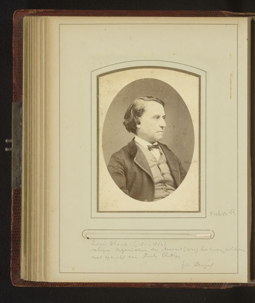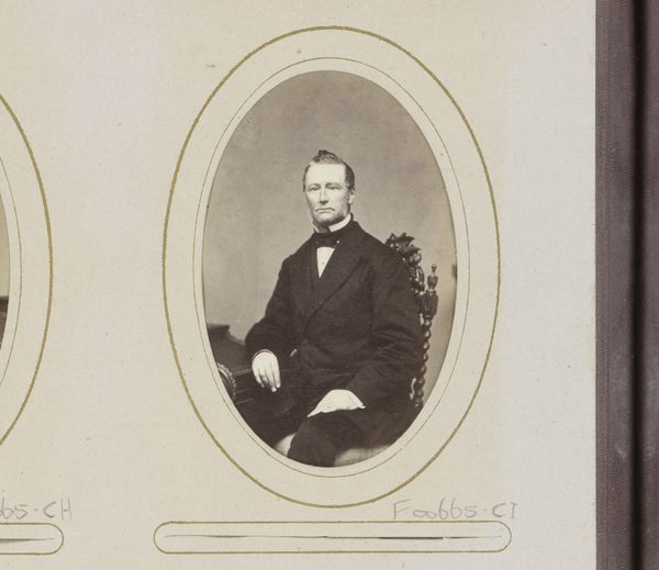 Curator: This is a gelatin-silver print entitled "Portret van een man," dating approximately from 1871 to 1893, and attributed to Ed. Radermacher. Editor: He looks like someone you wouldn’t want to meet in a dark alley. No, actually, maybe I’m being unfair. He has a sort of haunted intelligence about him. Curator: Note how the tonal range within the gelatin-silver print creates a nuanced texture, especially visible in the soft gradation of light across the man's face and attire. The limited depth of field, typical of photographic portraiture of the era, directs our focus firmly upon his expression. Editor: You know, in this tiny frame, the detail still just blows me away. The shadow falling across his right cheek – *his* right, not ours – adds a dash of moody mystery to the composition. It reminds me of those intense character studies Rembrandt was so good at. Only with photography. Curator: The photographic portrait's emphasis on realistic depiction connects it to the Realist movement dominating European art in the mid-19th century. It invites discussions on individual identity and social representation in that historical context. Editor: The dude’s totally got a story to tell. Like he knows some huge secret or carries a deep burden. It's weird. Even the backdrop behind him, that ornate frame, somehow adds to the gravity of it all. A subtle yet significant component. Curator: I agree, the backdrop is interesting. The ornamentation contrasts with the man's relatively simple attire. There is something fascinating in the details when examining such a carefully curated shot from a bygone era. Editor: Well, that certainly gave me food for thought! A fascinating glimpse into another life. Curator: Indeed, it underlines the complex interaction between artistic intention, material form, and historical meaning.