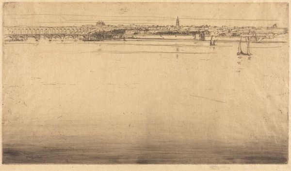 Curator: This is Thomas Girtin’s "View of the Village of Chaillot." It’s an etching, offering a panorama of Paris from across the Seine. Editor: There's something so delicate about the lines; it feels almost like a memory fading into paper. What materials were available at the time to create such fine detail? Curator: Girtin would have used copper plates and etching tools to achieve that level of detail. It gives us insight into the printmaking process of the period. It captures Paris on the cusp of major political and social upheaval. Editor: Yes, you can see the leisure of the citizens, juxtaposed against the implied power of the architecture—a social commentary, perhaps? It also reflects the evolving imagery and its role in Parisian life. Curator: Absolutely. It's fascinating how this particular medium allowed artists like Girtin to disseminate views of Paris to a wider audience. Editor: Seeing it, you can’t help but consider how that availability shaped the narrative of Paris, and, of course, the consumption of its imagery. Curator: It certainly makes you appreciate the interplay between art, history and societal impact. Editor: Indeed, especially concerning the materials, techniques, and labor involved. It highlights the complex dialogue between art and production.