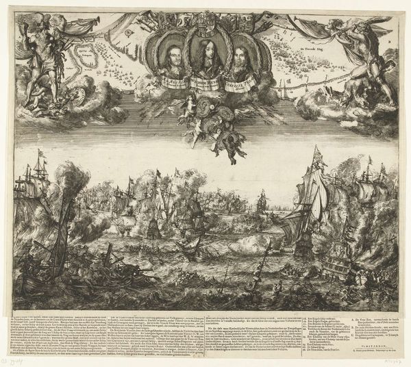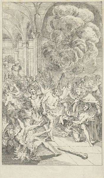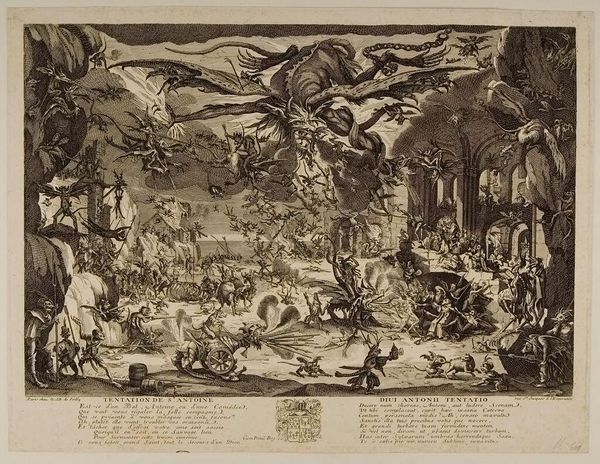 Curator: This print, attributed to Jacques Callot, is known as *The Temptation of Saint Anthony*. The scene teems with demonic figures assaulting Saint Anthony. Editor: My first impression is of pure chaos. It's almost overwhelming, this swirling vortex of grotesque creatures. I wonder, is this merely a spectacle of horror, or does it speak to deeper societal anxieties? Curator: I think it’s both. Callot, active during a period of religious and political turmoil, uses Saint Anthony’s story as a lens. Consider how power structures—the Church, the aristocracy—often perpetuate narratives of good versus evil to maintain control. Editor: Exactly! Anthony's suffering becomes symbolic. We can read it as a commentary on resisting oppressive forces, whether those are religious dogma or socio-economic inequalities. How does Anthony navigate this? Curator: Ultimately, it underscores the individual's struggle against overwhelming societal pressures, a theme that resonates even now. Editor: Precisely, and perhaps the chaos is a reflection of the internal struggle for moral purity. Thank you.