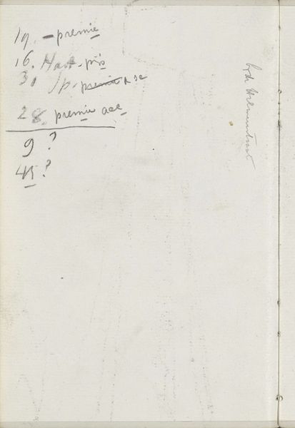 Curator: What strikes me first is the utter mundanity. It's just a page torn from a sketchbook. Scribbled notes, almost like a grocery list, really. Editor: Precisely! Though that surface simplicity belies a great deal, doesn't it? We're looking at a page from Gerrit Willem Dijsselhof's "Notities over kunstwerken," created sometime between 1876 and 1924. It's a mixed-media piece – drawing in ink on paper – housed right here at the Rijksmuseum. Curator: Yes, but look at the marks themselves! The interplay between text and number. The artist's hand so clearly present in the variations of line weight and the almost rhythmic repetition of forms. Semiotically rich, wouldn’t you say? Editor: I would indeed. And from a historical point of view, these notes are like little time capsules, offering insights into Dijsselhof’s creative process. Think of the exhibitions planned, perhaps, or the commissions considered. These sizes he notes are almost definitely for upcoming painting projects! Curator: The arrangement of the page itself creates a visual hierarchy. The boldness of certain notations… it begs the question, what was most important to the artist at that particular moment? Which, in essence, shows how all his potential commissions will work well as part of a larger composition? Editor: Exactly, or rather, it poses questions *for us*! These aren't pronouncements but records, open to our interpretation. Moreover, its placement within the Rijksmuseum transforms a private document into a public artifact. The politics of display subtly elevate the everyday, imbuing these commonplace notations with an unexpected significance. Curator: Ultimately, its impact lies in the raw intimacy it provides. One gains privileged access to an artist's mind as it is unfolding. We are seeing an artistic genius play and scheme his way into bigger, more challenging artworks. Editor: An intimacy made possible by the institution. A testament to the role of museums in shaping how we understand not only the art but the artist. Thank you for allowing me to consider this humble-looking piece through your focused eye, it reveals something powerful about the nature of an artist. Curator: The pleasure was all mine. Sometimes the most seemingly minor objects are actually among the most resonant. The Rijksmuseum collection has such a wealth of artwork in store, to get people considering art in all aspects of life.