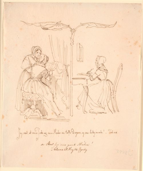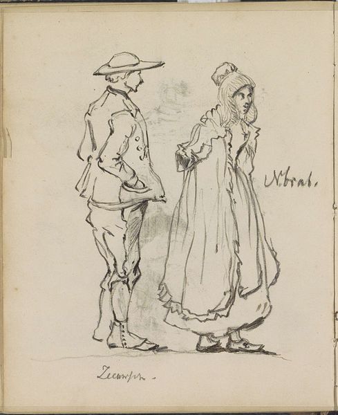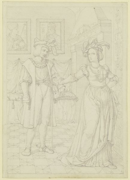 Editor: This is "Two Forces," a drawing by Sir John Tenniel from 1881, rendered in pencil and ink. It seems to depict a rather volatile figure confronting a more serene, classically draped one. What stands out to you in this piece? Curator: The visible labour involved in Tenniel’s draftsmanship is key. Notice the careful layering of pencil and ink, creating both texture and a clear sense of form. How does the chosen medium—drawing, typically associated with preparatory work—affect your understanding of its purpose? Editor: I suppose it feels less… precious? Like a sketch exploring an idea rather than a finished statement. Curator: Exactly! And considering Tenniel’s work as a political cartoonist for "Punch," the raw, unrefined quality of the drawing arguably reflects the immediate social tensions and production constraints he would have faced in providing timely commentary through images. What’s your interpretation of those ‘forces’ at play, depicted materially through line and form? Editor: Perhaps it represents conflict, or maybe resistance against some form of oppression, with the classical figure representing… Justice? Or stoicism in the face of adversity? Curator: Note the industrial revolution happening, bringing raw materials to play such as mass produced paper, affordable inks and pencils to many who were shut out from painting previously, for example, people who previously prepared pigments and tools. We can view “justice” in the sword acting as a division point. Note her classical drapery; could that serve as commentary itself? Editor: The deliberate act of creation becomes a statement itself...it suggests accessibility but also alludes to earlier established traditions... almost setting a historical precedence for such commentary? That's insightful. Thanks! Curator: Indeed. The materials and means of production give context to the very messages the artwork can relay. It's been enlightening to reconsider its meaning through this lens as well.