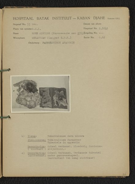 Curator: Today we're looking at a photograph titled "Drie blinde kinderen," or "Three Blind Children," taken in 1929 at the Hospitaal Batak Instituut. It's a striking, small, black-and-white print, likely documenting patients. Editor: My first thought is how deeply sad this image is. The children's expressions... their vulnerability is palpable. Even the framing, placed as it is on what seems to be a ledger page, creates a clinical, detached feeling that amplifies the emotional weight. Curator: Precisely. The photograph itself functions as both an evidentiary record and a form of what could be termed primitive medical advertising. The stark contrast between the children's states of health, explicitly written in Dutch, and the staged appearance really highlights a brutal colonial-era objectification. Editor: This raises so many ethical questions about representation and power. Who authorized this photograph? What were the circumstances surrounding its creation? The caption clearly indicates the children's ailments, stripping them of any agency. Also the term, "africain-art", seems entirely misapplied; I want to know how it was catalogued? Curator: Exactly! This wasn’t just a photograph; it was a tool for a very particular colonial agenda. We need to look into what was circulated with this photograph, the medical establishment, the network that produced these images, and how it played into colonial projects, both medical and administrative. The work exists in this intersection of documenting disease but it also uses those medical conditions in terms of consumption and spectatorship, ultimately to promote these western projects, even at the expense of their subject. Editor: Agreed. This photo becomes a lens through which we examine the historical power dynamics and the instrumentalization of vulnerable subjects. It forces us to confront difficult histories and consider our own roles as viewers and interpreters. We must contextualize the children as victims in a society controlled by a medicalized regime imposed by another system to scrutinize who had the capacity of defining, recording and preserving memory and knowledge. Curator: It also underscores how critical it is to approach such images with critical awareness, always questioning the purpose, the narrative, and who is truly served by it. Editor: Absolutely. Let’s not forget those faces of “Drie blinde kinderen”, hopefully sparking conversations to bring necessary transformation and respect into healthcare in today’s world.
