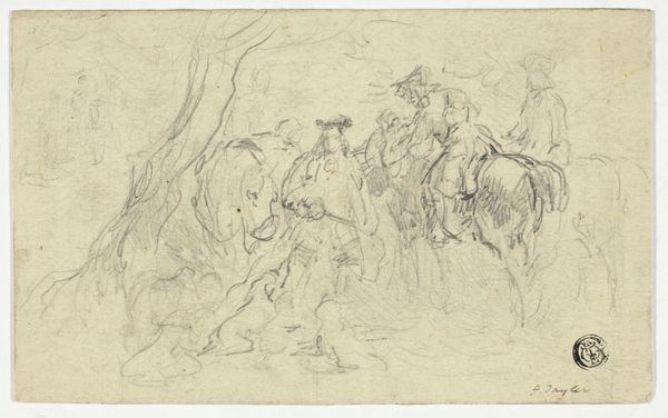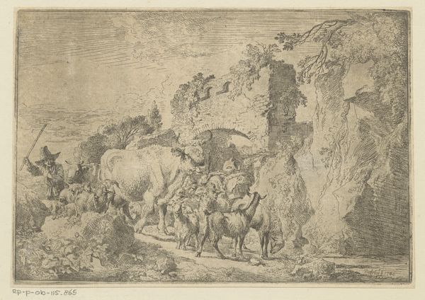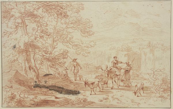 Editor: This drawing, ink on paper, is titled "Ein auf einem Ochsen reitender Hirte treibt seine Herde heimwärts" by Johann Heinrich Roos, held in the Städel Museum collection. It's an interesting landscape... somewhat faded, though the composition holds together remarkably well. What do you see in the relationships between the figures? Curator: The most apparent structural element is the rhythmic, almost musical, use of line. Roos establishes spatial depth not through tonal variation, but through line weight and density. Notice how the heavier, more confident lines define the ox and rider in the foreground, contrasting with the delicate, almost ephemeral, lines used to suggest the distant landscape. Editor: So the focus is more on the execution of line and its effect? It’s almost like he's composing with the pen itself. Curator: Precisely. The density and directionality create a sense of movement, guiding the viewer’s eye through the composition. Consider, for example, the way the lines describing the trees on the right side mirror, to some extent, the flock towards the left. Editor: Now I see, a balanced distribution of graphic information. I had overlooked that echoing. It pulls it all together even more than I initially thought. Curator: The medium itself, the relative immediacy of ink, allows for this fluid capture. It seems Roos sought to dissect and articulate movement using simple contrasts: thick versus thin, dense versus sparse, near versus far. Editor: Thanks, I now appreciate that it isn’t about precise representation but about how Roos organizes form to create space. Curator: Indeed. And by focusing on these formal elements, we can engage with the artist's creative choices, almost independent of subject. The true subject, one might argue, is the interplay of line and form.