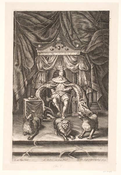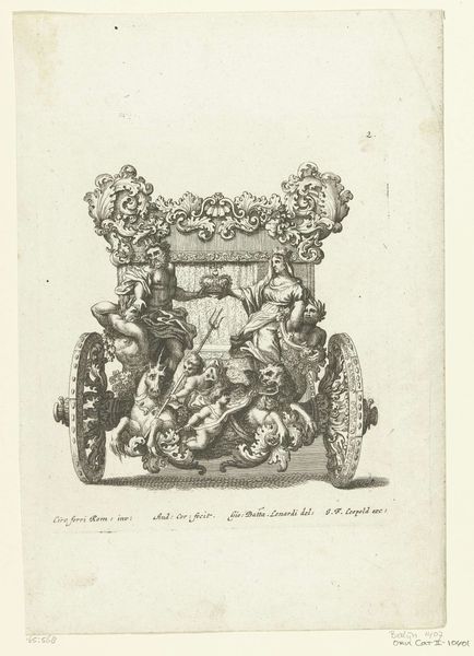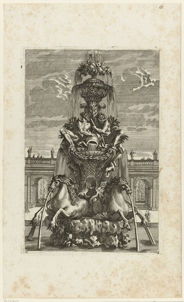 Jean Lepautre created this etching of a fountain with seahorses in the mid-17th century. The print reflects the grandeur and theatricality characteristic of the Baroque period. Lepautre was working in a society deeply structured by class and power, where art often served as a display of wealth. The fountain, with its cascading water and mythical figures, embodies a desire for spectacle that catered to aristocratic tastes. The image of seahorses and classical figures reflects a cultural fascination with antiquity, typical of the period. The fountain is brought to life through the artist's skilled rendering of texture and form. It’s easy to imagine the cool spray of the fountain on a hot day, the sound of water filling the air. This etching reminds us how art can serve as both a reflection of societal values and an invitation to engage our senses.