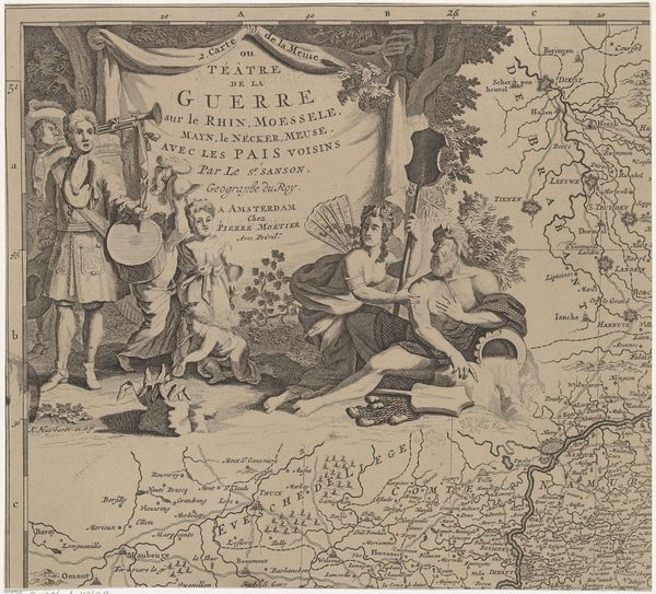 Editor: This engraving, dating from somewhere between 1689 and 1712, is called "Kaart van de regio Solms tussen Marburg en Frankfurt am Main in Duitsland (blad rechtsboven)" and it was created by Cornelis Huyberts. It feels almost theatrical, doesn’t it? A real stage for conflict. What story do you think it's trying to tell? Curator: It is theatrical! For me, the image explodes with paradox. It depicts the cold, calculated nature of cartography – yet it’s overflowing with allegory, figures from classical antiquity, war, cherubs… all rendered with incredibly fine lines. A very Baroque juxtaposition, don’t you think, of order and chaos? Do you notice how the artist weaves together devastation with an almost ornamental beauty? Editor: I do now! It’s a map, but it's also trying to make a statement about war… almost like a political cartoon? Curator: Exactly! This map is more than just geographical data; it's a commentary on the “theatre of war,” a term boldly emblazoned across the page. The burning villages, the stoic soldier… each element points to the devastating consequences of conflict, all framed within this incredibly ornate design. Are those angels playing with weapons above the title? I find that darkly funny! Editor: Yes! This has completely shifted my perspective. I was initially drawn to the drama, but I didn't appreciate how much commentary was embedded within the design itself. Curator: It’s like a beautiful, terrible dream, isn't it?