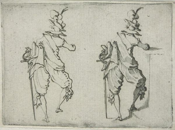 Curator: Jacques Callot's etching, "Two Men, Seated" presents us with, well, two men sitting. They look rather...disheveled? Editor: Look closer at Callot's technique here. The etching process allowed for detailed lines, but the real story is the socio-economic context that shaped his subjects. These aren't just any men; they represent the everyday laborers and marginalized figures he often depicted. Curator: Marginalized, perhaps, but there’s a swagger. The man on the left, with his feathered hat and sword, and the other writing something… What kind of labor were they engaged in? What does their clothing signal about class and consumption? Editor: Exactly! Callot's skill lies in transforming these men into social documents. His etchings circulated widely, functioning as both art and social commentary, reflecting the hierarchies of the time. Curator: It makes me wonder about who acquired his prints and how they viewed the realities he represented. Editor: Precisely. Art as a lens onto social dynamics. Callot encourages us to ask critical questions about the seen and unseen forces shaping society then, and now. Curator: Thank you, that offers a new layer to appreciate. Editor: Indeed. Every line tells a story.
