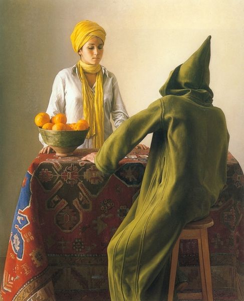 Curator: Oh, there's a heavy story written all over this one. The way the man’s shoulders are slumped... it just whispers of endurance. Editor: We’re looking at "Jamal Al Mahamel III (The Camel. Carrier of Hardships III)" by Sliman Mansour, painted in 2005. It's an acrylic on canvas, portraying a man bearing a cityscape on his back. Curator: A whole city! He’s literally carrying its weight! The cool tones and diffused light give it this dreamlike—or maybe even nightmarish—quality. And the curve that carries the town itself creates a haunting halo effect around him. Do you feel that melancholic pull, too? Editor: Absolutely. The "Camel" metaphor here is crucial. Mansour is drawing on a long history of the camel as a symbol of resilience and survival in Arab culture. To show this man burdened by the cityscape suggests a collective suffering, the weight of history and displacement that Palestinians carry. Curator: The loose wraps that seem to form the halo shape around the city. Are those tattered prayer beads? Maybe they evoke stories and dreams holding up his burden? It could be nothing… but to me, the curve evokes all those swirling, bittersweet stories you’d get sipping mint tea on a hazy afternoon. Editor: And think about that dome—it clearly represents Jerusalem, a potent symbol of cultural and national identity. Mansour often engages with themes of resistance and the preservation of Palestinian heritage. In this piece, he visualizes how history is embedded in the very bodies of the people. This evokes questions about who gets to write the narratives and carry on the story. Curator: And this piece manages to do so with so few clear statements. He gives the essence of this heavy lifting, then lets the soul fill it in with feeling. The longer I gaze, the more its presence hums within me. Editor: Indeed. Mansour gives us a striking reminder of the intimate connection between people, their land, and the enduring strength it takes to carry the weight of that bond.