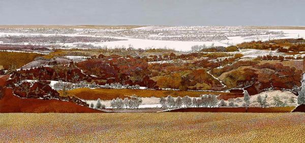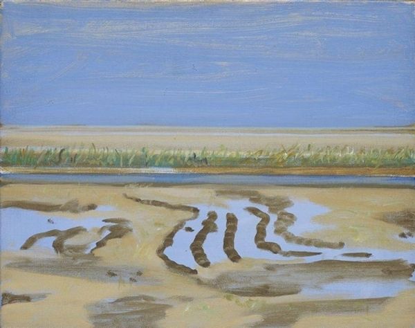 Editor: So, here we have Ivan Eyre's "Valley Gate" from 1981, rendered in acrylic. I find the composition quite intriguing— almost a series of horizontal planes receding into a hazy distance. What strikes me most is its static and surreal atmosphere. What do you see in this piece? Curator: The geometry in Eyre’s landscape certainly arrests the eye. Notice how these stacked, sharp bands evoke a dreamscape. This painting reads to me as a cartography of the mind—perhaps of memory itself. Does the ordering of planes bring any other cultural images or mythologies to your mind? Editor: A cartography of the mind—I like that. The strict geometry reminds me a little of early Renaissance landscapes… maybe Lorenzetti’s frescoes in Siena? It feels less about representing reality and more about conveying an underlying order. Curator: Precisely! And consider the symbolism of a gate, even an implied one, in a landscape. Throughout art history, gates signify transitions, thresholds between known and unknown worlds. The valley beyond could be read as potential, or even a spiritual plane. The hazy distance speaks of future possibilities and transformations. What does this symbolism evoke for you? Editor: Transformation, definitely. The muted colours, combined with that geometric structure, make me feel like I am seeing not just a landscape, but the idea of a landscape... stripped back to its essential forms. It’s fascinating to consider how that abstract interpretation can be just as emotionally resonant. Curator: And there we have it – the personal journey facilitated by a symbol-laden image. Through its unique visual language, this artwork fosters a conversation about perception, memory, and potential transitions we encounter on our own journeys.