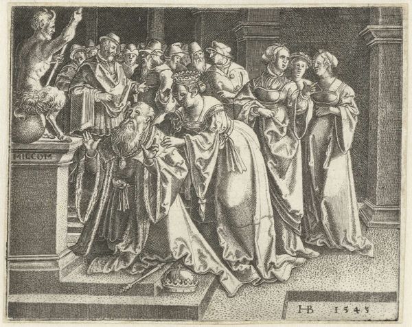 Editor: So, here we have Simon Frisius’s engraving, "Mass of St. Gregory," from between 1610 and 1630. It's incredibly detailed, almost overwhelming with figures. What do you see in this piece, in terms of its broader message? Curator: I see a carefully constructed image of power and the intersection of the spiritual and earthly realms, but not without critical commentary. Look at the placement of Christ. Isn't he depicted as if wounded, manufactured? It suggests an institution grappling with its own legitimacy amidst societal shifts. Editor: Yes, now that you point it out, Christ does seem almost like a… stage prop. I hadn’t thought of the image that way, but what societal shifts are you referring to? Curator: This piece comes from a period marked by intense religious and political upheaval—the Reformation, the Counter-Reformation, rising nationalism. What is Frisius trying to say by placing a wounded, manufactured Christ front and center during a liturgical celebration? It begs us to examine who benefits from perpetuating images of suffering, and the control exerted by religious institutions. Editor: It almost feels like a critique of the performative aspect of religion, with Christ as the ultimate symbol being wielded for political gain. Curator: Precisely! The very staging of the Mass – the grand architecture, the sheer number of figures present – speaks to a consolidation of power. How do you think the intended audience might have reacted to this image? Did it reinforce their faith or sow seeds of doubt? Editor: I hadn't considered the level of political commentary embedded in the art. The amount of scrutiny placed on power dynamics adds an entirely new depth to the work! Curator: Right, art doesn't exist in a vacuum, and it's by investigating it under the right sociopolitical scope that we reveal an artist’s position. Editor: Exactly. I am more motivated to visit the Metropolitan Museum of Art to further my education and delve deeper into Frisius' commentary!