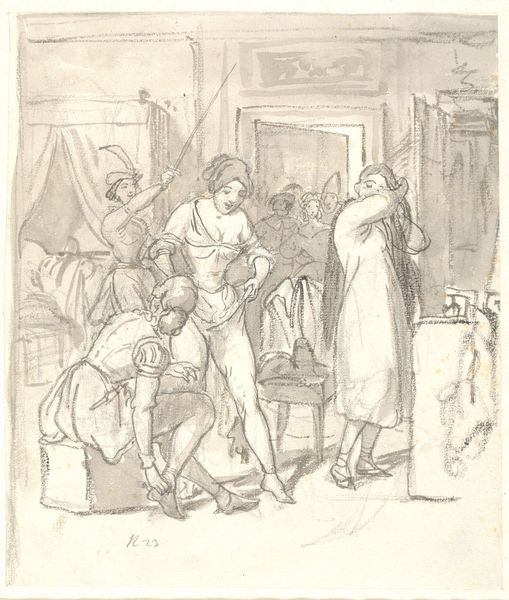 Editor: Here we have a pen and ink drawing by Pietro Antonio de' Pietri entitled "Der Heilige Nikolaus von Bari erweckt drei Knaben vom Tode" - "Saint Nicholas of Bari Reviving Three Children." I find it has a rather spontaneous feel with all the quick, thin lines, despite depicting a rather dramatic scene. What’s your interpretation of this piece? Curator: Considering the baroque period’s grand theatricality, this drawing serves as an intriguing study in image politics. Note how Saint Nicholas is positioned centrally, his outstretched hands acting as a conduit between the divine realm above and the children below. Editor: I see, he's visually mediating power. How did that kind of image function in the cultural sphere then? Curator: Remember, baroque art frequently functioned as propaganda. De' Pietri presents the Church, represented by Saint Nicholas, as an active, benevolent force. Observe how the act of resurrection reinforces the Church's perceived power. The visual cues, like the descending light, amplify this narrative of divinely sanctioned authority. Editor: That's a very insightful point about the "propaganda." Were these images explicitly commissioned with such a purpose? Curator: Often, yes, explicitly or implicitly. Patrons, whether the Church or wealthy individuals, used art to reinforce their positions. Think about the function of spectacle and emotion during the baroque period and how this image participates in those tendencies. It stirs awe. Editor: So it's about instilling faith and securing the Church's social role through emotional visual narratives. It’s definitely more complex than it seems initially! Curator: Precisely. Analyzing these elements sheds light on the complex relationship between art, power, and belief in 17th-century Europe. Editor: I never considered drawings in terms of power dynamics, focusing more on the art aspects. Now, I can see the importance of historical context.