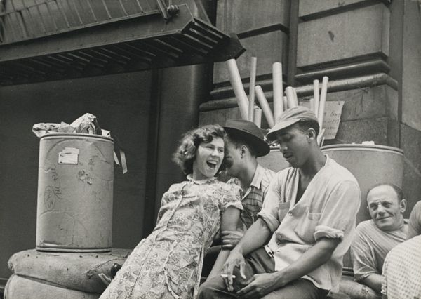 Editor: So, here we have Alfred Stieglitz’s "Georgia O'Keeffe and Frank Prosser," a gelatin silver print from 1931. The grayscale gives it such a somber mood. Both figures are arranged in a somewhat triangular composition; they look a bit detached. What's your perspective on this photo? Curator: Notice how Stieglitz orchestrates a study in contrasts through form and tonality. The stark white of the porch pillars, for instance, immediately catches the eye. How does that bright vertical element interact with the diagonal slope of the porch floor and the dark rocking chair? Editor: The stark pillars create contrast and balance, but they almost seem like a barrier, which enhances the sense of detachment that I felt before. Curator: Precisely. The textural contrast is significant as well, with smooth, pale skin offset by coarse fabric and wood. What about the visual relationship between the two figures? Are they truly disconnected or linked in a more subtle way? Editor: While they're clearly separate, they seem connected through line of sight, in that we the viewer see them both. Perhaps it is a visual alignment of posture and gaze, suggesting an unseen bond. Curator: And that alignment, framed by the architectural elements and modulated tonality, creates a rigorous composition that transcends a mere portrait. It becomes a formal exercise, almost an emotional equation to solve. What do you make of Stieglitz choosing to represent his wife alongside this young man? Editor: I now realize it isn’t just a portrait; it’s a composition of visual and emotional tension, captured through subtle arrangements of form and tone, so much deeper than what meets the eye. Thanks for illuminating that. Curator: And thank you for prompting such insightful observations. It's precisely that interplay of form and light that elevates photography beyond representation, into the realm of abstract expression.