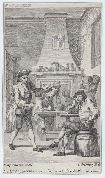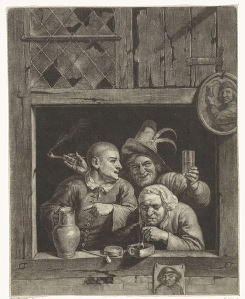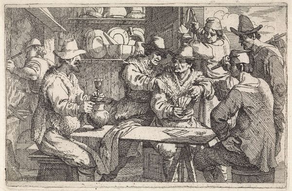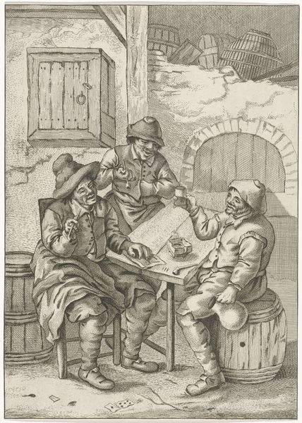 Justus van den Nijpoort’s etching, *Interieur met kaartende boeren*, captures a boisterous scene inside what appears to be a rural tavern. Van den Nijpoort, working in the mid-17th century, lived in a Dutch Republic experiencing economic expansion. Here, we see the lives of peasant farmers, as they engage in leisure activities like drinking and card playing. Taverns during this time were social hubs, crucial for the working class. While the scene appears lighthearted, it invites a deeper look into the class dynamics of the era. The detailed rendering of the interior and the figures’ clothing offers a glimpse into the material conditions of their lives. There's a certain tension, too, in the image - the contrast between the farmers' hard labor and their moments of respite. Does the representation romanticize rural life, or does it offer a more realistic portrayal? How do the figures' interactions with each other reflect the social bonds within their community? The act of coming together provides a sense of unity, and offers a space for the negotiation of social identities during a transformative period in Dutch history.
