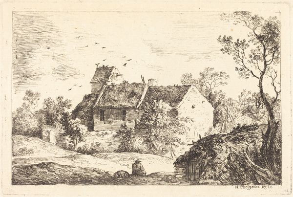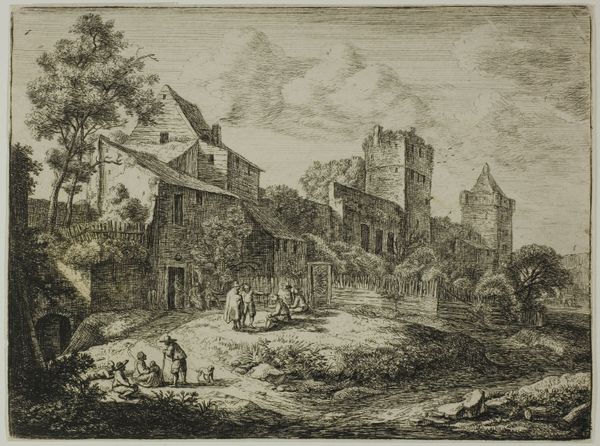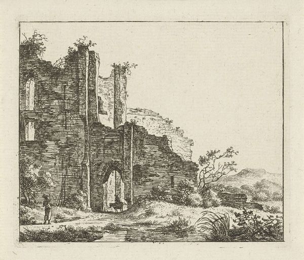 Frédéric Theodore Faber made this etching, "Herderin bij ruïne", meaning Shepherdess at a Ruin, in 1805. It’s created through a chemical process - acid biting into a metal plate, to hold ink - and then a mechanical one, pressing the plate onto paper. The contrast between the pristine, untouched paper and the dark, precise lines of the etching give the work a striking visual quality, lending it a graphic immediacy. Consider how the artist uses line to convey the texture of the stone ruins, the softness of the foliage, and the forms of the figures. Etching was a relatively democratic medium, allowing for the wide distribution of images. In this case, it presents a romanticized view of rural life. The woman tending her animals, the crumbling architecture – all speak to a longing for a simpler, pre-industrial past. Yet the very means of producing this image – through industrial materials and processes – ties it to the modern world it seems to critique. So, when we consider this print, let’s appreciate the skill involved in its making, and also the social context that gives it such resonance.
