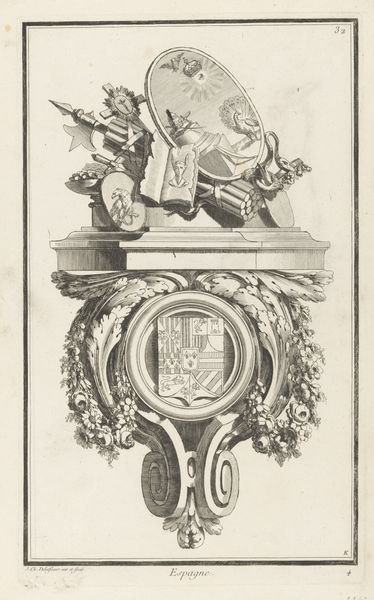 Albrecht Durer created this intricate print, "Wapens van de families Scheurl en Zinger", using black ink on paper. The immediate visual experience is dominated by the ornate, symmetrical composition. Shields bearing heraldic symbols are framed within a circular wreath, intertwined with flowing ribbons and grotesque figures. The use of line is meticulous, creating a sense of depth and texture, drawing us into the symbolic world of family lineage and power. Durer masterfully employs the language of heraldry to communicate status and identity. The animals—griffins and unicorns—aren’t merely decorative; they function as signs, encoding specific attributes and histories associated with the families. The text, inscribed on a tablet, asserts a divine connection, reinforcing the nobility's authority. The overall effect is a complex interplay of visual and symbolic elements, reflecting the hierarchical structures of Renaissance society. Consider how Durer’s art functions as a site where social meanings are both reinforced and potentially interrogated through the very act of representation.