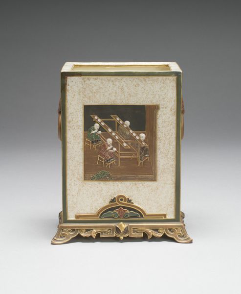 Editor: This exquisite snuffbox, crafted by Louis Roucel between 1768 and 1769, features ivory and metalwork. I'm struck by its depiction of what looks like a rhino in an exotic landscape – it’s so detailed for such a small object. How do you interpret this miniature scene? Curator: It’s tempting to view this simply as Rococo decorative art, but let’s unpack the "orientalism" at play. How does it reflect the European fascination with, and often misrepresentation of, other cultures? Editor: I see it in the palm trees and what looks like Asian-style architecture on the sides. So, it’s not really about accurately portraying those cultures? Curator: Precisely. This isn't about authentic representation but rather about constructing a fantasy – a playground for European imaginations fueled by trade and colonial ambitions. What does it tell us about power dynamics of the time? The rhino itself, as a symbol of the "exotic," is being literally contained. Editor: So, the beauty and intricacy almost mask a more problematic narrative? It makes me question what’s absent here. Who isn’t being represented, or is being misrepresented, in this "fantasy?" Curator: Exactly! By critically engaging with objects like this snuffbox, we can uncover the complex histories of cultural exchange and power that shaped not only the art of the period, but also our understanding of the world today. Editor: That really shifts my perspective. I now see it less as just a pretty object and more as an artifact of cultural appropriation, ripe for critical discussion. Curator: And that’s the beauty of engaging with art history through a critical lens, right? It pushes us to ask questions and see beyond the surface.
