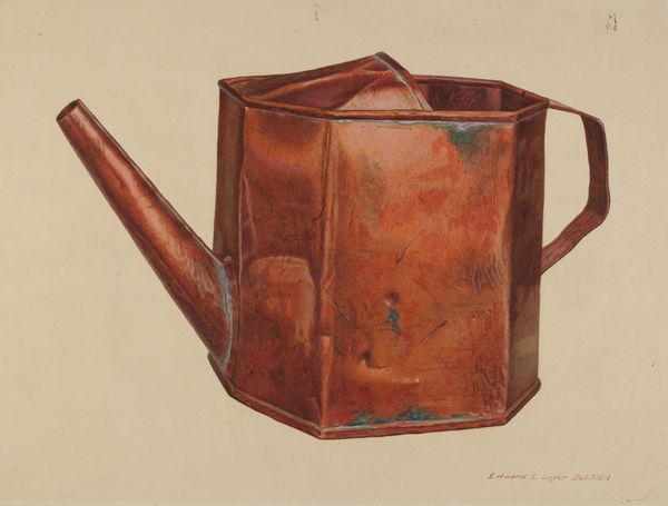 Dorothy Brennan created this watercolor painting titled "Cow Bell," its dimensions measuring approximately 23 by 31 centimeters. Immediately, we're drawn into the world of texture and form. Brennan’s choice to depict these aged objects head-on is intriguing. Their surfaces, marked by time and use, are rendered with a deliberate, almost forensic, attention to detail. The rust and wear aren't just superficial; they speak to the history and function of these bells. The contrast between the solid, upright bell and its counterpart lying on its side introduces an element of spatial and functional play. Consider the semiotic implications. The cowbells themselves are signs, symbolic of rural life. But their depiction here—isolated, examined—raises questions about value, utility, and the passage of time. Does the artwork challenge fixed meanings or engage with new ways of thinking about space, perception, power or representation? The materiality of watercolor lends itself beautifully to capturing the subtle nuances of the bells' surfaces. This close attention to the texture and form functions not just aesthetically but also as part of a larger cultural discourse.