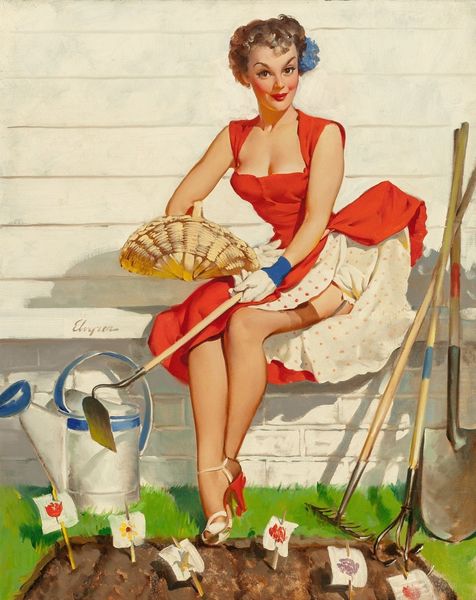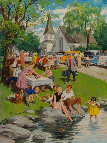 Arthur Sarnoff’s painting captures a family planting in their garden, an image brimming with symbols of growth, renewal, and domesticity. Consider the act of planting a tree. Since ancient times, trees have been symbols of life, stability, and family lineage. This motif is not unique; images of planting trees are seen in ancient Egyptian art and resurface in Renaissance tapestries, each time carrying the weight of prosperity and longevity. Notice also the presence of flowers, traditionally symbols of beauty and transience. They echo in Botticelli’s *Primavera*, yet here, they are contained, cultivated, brought under domestic control. The act of gardening speaks to a deeper, almost primeval connection with the earth. It mirrors the sowing of seeds of civilization and echoes through generations, suggesting a longing for harmony. These symbols touch something ancient within us, a deeply rooted recognition of life's cycles and our place within them. Thus, the image is not merely a scene of suburban life, but a tableau rich with layered meanings, constantly reborn through cultural memory.