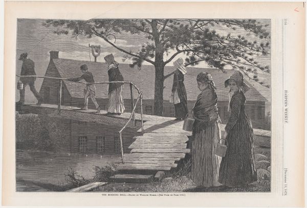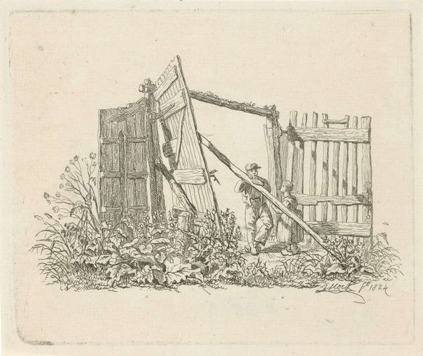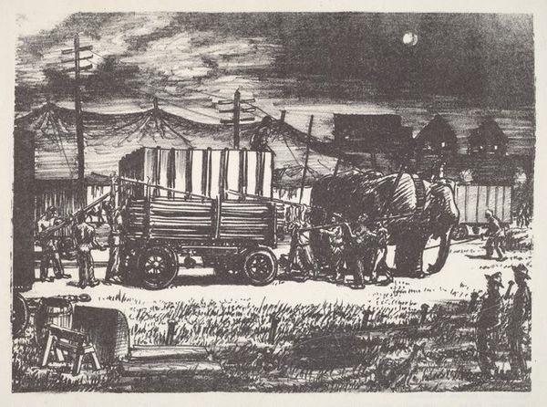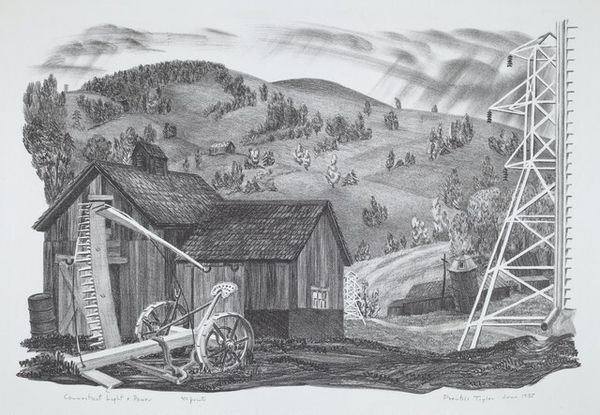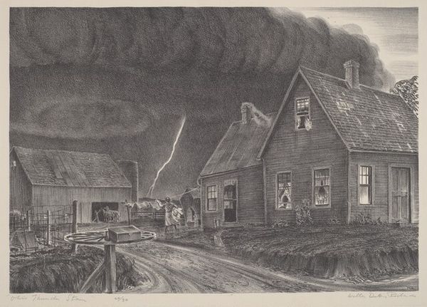 Curator: This compelling graphite drawing, entitled "Story of the Flood" was created around 1936 by Larry C. Rodda. What are your initial thoughts on it? Editor: A quiet terror pervades this piece. It is a strangely still scene of catastrophe rendered with unsettling precision, the detailed linework almost mocks the escalating drama. Curator: It's striking, isn't it? Rodda’s choice of a narrative-driven subject, coupled with realistic style, anchors it within the broader Social Realist movement, capturing the anxieties and resilience of people facing disaster during that era, especially the Great Depression. The ubiquity of printmaking allowed such images to circulate widely. Editor: I agree, though it's interesting how the "everyday" is foregrounded here through the quotidian nature of a single home. Even those rocking chairs stacked on the porch ceiling gesture towards the materials lost and at stake. We also have a visual record here in graphite and print of survival and a portrait of localized environmental and social vulnerability. Curator: Indeed. We see figures actively being rescued from their rooftops, while other, better off, figures appear rather calm and comfortable as the flood laps at their porch. What’s intriguing is the staged quality—the way it invites contemplation on class, access, and social order, brought sharply into focus by environmental hardship. Editor: And notice how he manages to get the water's reflective properties—how it blurs and mirrors elements above the surface with a careful distribution of dark and light that heightens the chaos and precariousness of it all. Graphite really allows for close looking. Curator: Absolutely. In displaying this moment, Rodda asks the audience to ponder not just the immediate crisis, but also who survives and who remains stranded in times of systemic disruption. Editor: The composition, though seemingly simple, carries so many complex layers of class disparity revealed through domestic architecture, possessions, and interpersonal connection through shared catastrophe. Thanks for giving such necessary historical background to these stark realities! Curator: And thanks to you, as always, for examining the textures and physical qualities within it, rendering even more layered observations to draw from this drawing.