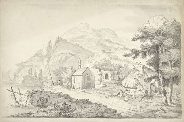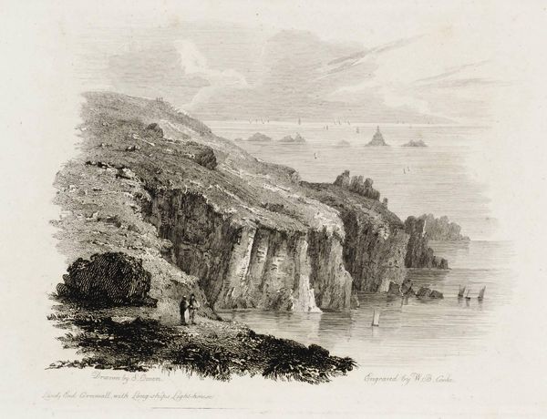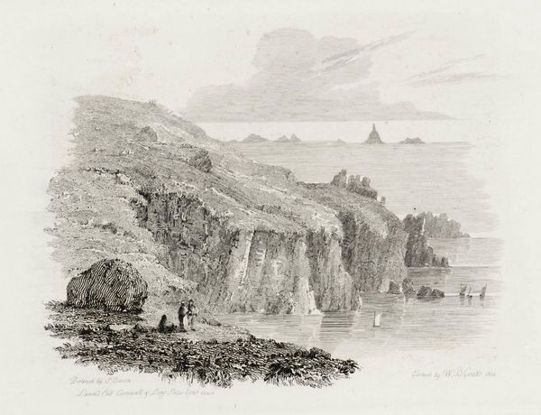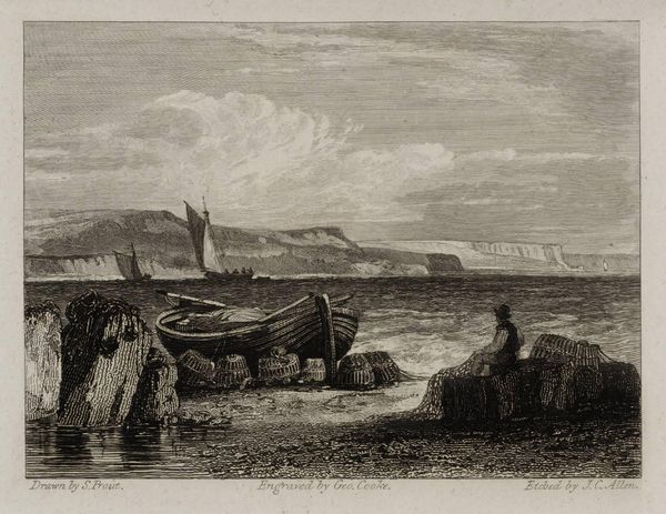 Curator: Luke Clennell's "Ventnor Cove, Isle of Wight" presents a quiet coastal scene. The print captures a small cove with figures near boats and rudimentary structures dotting the landscape. Editor: It feels melancholy. There's a sense of isolation, a starkness in the simplicity of life depicted. How does this relate to Clennell’s own struggles? Curator: Clennell, who lived 1781-1840, mastered engraving. The etching process allowed him to create finely detailed yet reproducible images, making landscapes like this accessible to a wider audience. Editor: The figures seem caught between land and sea, their labor intertwined with the natural world. Was this a conscious commentary on the social hierarchies present in rural England? Curator: Perhaps. His focus on ordinary lives suggests an interest in the working class, but it’s mediated through the commercial demands of printmaking. Editor: It makes me consider the viewer's position, too. We observe this scene from a distance, separated by class and time. Curator: Indeed, and his skillful use of the etching medium certainly heightens that sense of intimacy and distance. Editor: It’s striking how a simple image opens up such broad questions of labor, class, and the representation of rural life.