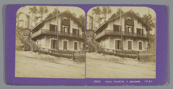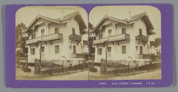 Editor: This is "Exterieur van de Villa Napoléon te Arcachon," taken between 1862 and 1876, by Jean Andrieu. It's an albumen print of a villa; almost like a stereo card view. I find the composition strangely compelling, the way the two identical images sit side by side. What jumps out at you? Curator: The fascinating element is the materiality of the print itself and its relation to architecture. The albumen process, using egg whites, created a specific type of commodity at this time, connected to consumer desires and rising social classes. What about the production of the villa, how it signifies an interesting investment? Editor: Interesting! I hadn't considered the connection between photographic material and the social implications of building a villa like this. Curator: Exactly. This villa, through its architectural design and materials, also reveals the availability of these commodities at a specific historical juncture. It highlights new materials like glass and the rising timber industry, doesn't it? Editor: It definitely makes you think about the social conditions necessary for something like this to exist and the work of laborers behind them! Does focusing on materials shift the meaning for you? Curator: Entirely. Looking at the villa as more than just an aesthetic object, as a material product shaped by economics, class, and technology, changes its narrative, from mere building to artifact. It encourages deeper contemplation. Editor: This approach has provided insight into both the albumen print and the building depicted within. Thank you for your time. Curator: My pleasure. Thinking through material production certainly adds dimensions to interpretation.