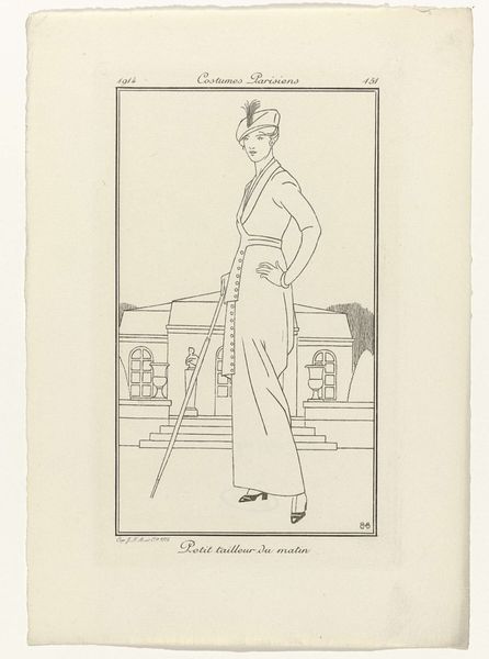 Curator: This ink drawing on paper, titled "Journal des Dames et des Modes, Costumes Parisiens, 1914, No. 138 : Robe de satin (...)" by André Stéfan, presents a striking vision of early 20th-century fashion. Editor: The piece exudes a sense of quiet elegance and perhaps, considering the date, an undercurrent of anxiety. The color palette is restrained, mostly blacks and whites, imparting a severe visual quality despite the delicate lines. Curator: Precisely. The formal elements are particularly interesting here. Note the careful delineation of line, the rhythmic verticality of the striped dress which plays off the cloud-like forms of the abstracted landscape, creating a visual dance. It embodies the Art Nouveau sensibility of finding harmony and balance in design. Editor: Yes, but it’s hard to divorce this image from the historical context of 1914, when Europe was plunging into the First World War. The figure, adorned in such opulent attire, stands in stark contrast to the looming devastation that was about to unfold, offering a critical view of class disparity. Was such elevated luxury blind to the circumstances about to change so many lives? Curator: That's a valid interpretation, certainly colored by the era's history. However, viewed through a lens of purely formal analysis, the image celebrates elegance through carefully balanced contrasts—dark and light, curve and line. One could perceive a meditation on shape rather than the anxieties of conflict and change. Editor: But can we really disregard the socio-political conditions under which such images were created and consumed? This "Journal des Dames" reinforced a certain societal order that relied on suppressing some to elevate others. The beautiful, refined line itself could be seen as an element in propagating those imbalances. Curator: Such nuances are not overtly displayed, and yet, are not outside the realm of inquiry, I concede. But perhaps its beauty provides momentary refuge for us too. Editor: Indeed, and perhaps it is precisely because of that beauty that we have the privilege of pondering it now.