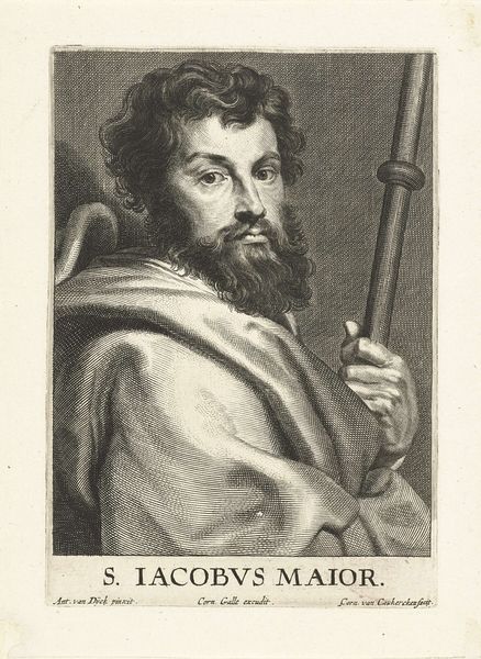 Curator: Take a moment to consider this arresting portrait attributed to Peter Paul Rubens, entitled “Saint Felix of Cantalice.” Editor: Wow, the drama! He emerges from near darkness, doesn't he? That hefty bag he’s holding looks ready to burst; you can almost feel the weight of the world on him. Curator: It's Baroque painting at its most fervent; that tenebrism is striking! Rubens expertly manipulates the dramatic contrast of light and shadow to heighten the spiritual intensity. Editor: Absolutely. He has this piercing look that really stays with you, kind of soulful. Is he bringing something or taking something away, I wonder? And why such enormous bags and the little rosary that hangs so humbly down? Curator: That question lies, in my opinion, at the heart of the work. As a Capuchin friar, Saint Felix lived a life of extreme poverty, giving all he had to the poor. Rubens captures this in the worn features, and in these items of service—perhaps food or alms he is about to distribute. It reminds me of Mother Theresa and it captures perfectly his commitment and humility. Editor: I see it! And the details, too, are pretty telling; notice the coarse weave of his robe—simple and practical. This really shows the visual storytelling you see in Baroque art. Curator: Precisely! Note, also, the composition and brushwork at play here, very intentional I am sure. There is an intentional sense of movement, and emotional force with this piece. Rubens uses very quick strokes of oil to create volume and mass to this austere scene. Editor: I didn’t think it could have been a “quick painting job,” but, it does bring it into a “living” feeling for us, some centuries after his death. Thanks for shining a light on it for us today. Curator: It's been a pleasure; so, what's next?