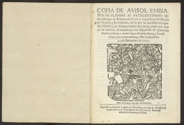 Curator: Here we have a page from “Convivio delle Belle Donne,” or "Banquet of Beautiful Women", dating back to 1532. It’s a woodcut, one of many pages from a book published in Venice by Nicolò Zoppino. Quite lovely, isn’t it? Editor: It's quite…stern, isn’t it? Almost austere. The heavy lines of the woodcut create a stark contrast on the page. The composition feels very formal, with that central image looking very... hieratic. There's an immediate sense of seriousness that really seizes you. Curator: "Hieratic" is a great word for it! The seated figure definitely holds a commanding presence. Notice the details in his robes and the pastoral staff; there is a real weight in those forms, beautifully rendered by the artist's skillful use of line. You feel you should bow before this powerful image. Editor: Absolutely, that contrast works wonders and almost evokes a sense of…submission, maybe even desperation from the other figure there. How does this narrative, this "Banquet of Beautiful Women," play into the historical and societal views of women at that time? Were these banquets actually inclusive and celebratory, or were they constrained by rigid patriarchal norms? Curator: Ah, context! Yes, this book, in its printed form, was likely consumed in intimate domestic settings by these very women. But it also circulated among literate men. As such, "Convivio" acts as an active reflection on the gendered discourse of conduct in the 16th century, at once reflecting and reinforcing prevailing views. Editor: Precisely. So even within the pretense of female festivity, what power structures and expectations were being subtly or not so subtly reinforced through works like this? How much agency were these women really afforded within these so-called convivial spaces? It is definitely thought-provoking! Curator: Yes, what's so interesting is the way such scenes were rendered with enough ambiguity to permit multiple readings. A kind of dance of suggestion and circumscription! In the woodcut, who is powerful and who is powerless depends entirely on one's cultural and aesthetic perspectives. That, for me, is what great art achieves! Editor: It reminds us how artworks from the past are not just aesthetic objects, but tangible reflections of the societal power dynamics and ongoing conversations. They carry historical echoes that need to be deciphered. It encourages us to keep the conversations going.