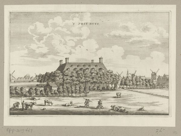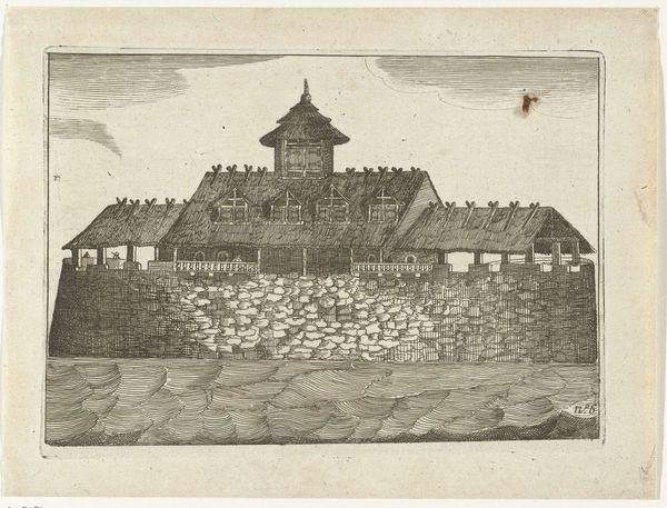 Editor: Here we have an engraving titled "Gezicht op de burcht van Leiden," made after 1675 by an anonymous artist. It's a cityscape, capturing Leiden's castle. The engraving itself has a very formal and almost dreamlike quality. What do you see when you examine this print? Curator: I’m drawn to the artist’s command of line. The meticulous strokes used to depict the brickwork of the castle, contrasted with the softer, more atmospheric lines suggesting the clouds, are remarkably skilled. Notice also how the receding lines of the covered walkway draw the eye into the center of the composition. Editor: I do see that now! So it's not necessarily about *what* is depicted, but rather *how* it's depicted? Curator: Precisely. The strength of the composition arises from the artist's formal arrangement of elements within the visual field: the interplay between the solidity of the built environment and the fluidity of the natural one. Do you notice any contrast in light values in the image, from bright to dark? Editor: The way the light seems to hit the castle wall, creating a defined shadow underneath is also really clever! How do you feel the "old engraving style" complements this scene? Curator: The monochromatic palette necessitates that form be created through tonality and line. The visual impression that comes from those lines is a kind of harmony achieved between the figures and architecture. Editor: That’s a fascinating point. Looking at it now, focusing on the lines, it seems more abstract and less like a direct representation. I really learned how formal elements are essential for an engraving style. Curator: And I rediscovered how an image, using such traditional means, still possesses the power to challenge the way we approach seeing.