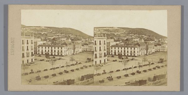 Curator: This albumen print by Carl Heinrich Jacobi, titled "Kurhaus in Bad Ems, Duitsland", dates from between 1868 and 1876. The albumen process gives it a unique sepia tone. What is your first impression of the scene? Editor: Tranquil and rather still. The reflections are mirror-like, and despite the scale of the buildings, there's a serene, almost melancholic atmosphere. I notice the ordered landscaping, but it does not disrupt the nature. Curator: Jacobi seems interested in conveying both order and a sense of romantic landscape. Note how the river acts as both a compositional element but also mirrors civilization and wild nature across its plane, hinting to psychological duality. Editor: Interesting. And the placement of the Kurhaus itself is important. Its grandeur and scale show a changing urban landscape amidst untouched mountains, an element used by those profiting from the popularization of these natural resources. I see this choice as highly symbolic of the era’s burgeoning middle class, their access to leisurely spaces shaping societal landscapes. Curator: Yes! The spa town represented leisure, luxury, even escape from everyday realities in German cultural consciousness. The architecture's visual language—the precise lines against a gradient background, invites readings into our conscious understanding of human experience contrasting nature and culture. Editor: The choice of albumen printing too – that particular softness it lends to detail. It romanticizes a building built in great part due to social pressures and capitalist motivations. The lack of human presence feels like an active attempt to emphasize idealized place, further feeding this visual tradition. Curator: True! Albumen print adds a veil of nostalgia over even contemporary subjects when viewed later, creating cultural memory of this site even from when it was new. This is an effect often desired in popular romantic photography. Editor: I think it does succeed! I am drawn in by how social history can be subtly framed by technological and stylistic decisions, leaving the viewer to wander and reflect on those social dynamics across the ages. Curator: A compelling discussion showing art can offer multifaceted ways of understanding symbols. I will keep reflecting on how photography became essential for developing place identity during transformative historical periods!
