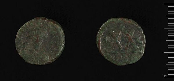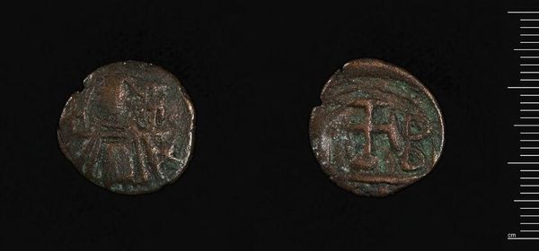 Curator: This is thought to be a coin of Justin II, an artifact that transports us back to the Byzantine Empire. Looking at it, what strikes you? Editor: There's an immediate sense of austerity. The portrait and imagery are worn, giving it an almost ghostly presence. Curator: Indeed. Its presence provides a compelling look into the construction of imperial power through symbolic representation. The coin, although diminutive, served as a potent symbol of authority and ideology. Editor: Given the socio-political climate of Justin’s reign, the coin’s imagery likely played a crucial role in negotiating power and religious ideology. It underscores how even everyday objects can become sites of cultural meaning. Curator: Precisely. Examining it allows us to consider the public role of art and its significance in shaping collective memory. Editor: This coin opens a fascinating window into the intersection of power, religion, and material culture in the Byzantine world.