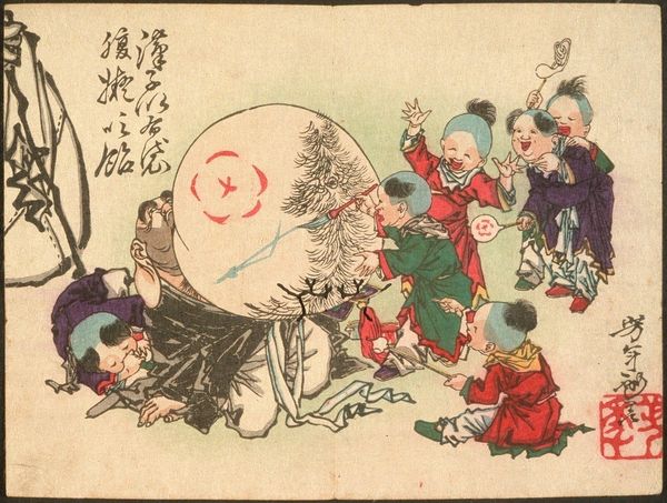 Tsukioka Yoshitoshi created this woodblock print, Yorimitsu, employing a striking composition of dynamic lines, contrasting colors and dramatic tension. The print captures a moment of intense action as the warrior Yorimitsu confronts a monstrous figure. Notice how the artist uses bold outlines and flat planes of color to define the figures and objects, typical of the ukiyo-e style. The exaggerated features and vibrant palette enhance the dramatic narrative, drawing our eyes to the confrontation between the hero and the supernatural being. Yorimitsu's dynamic pose, with his sword raised high, is juxtaposed against the grotesque form of the monster, creating a sense of imbalance and unease. Consider how the composition, with its off-center arrangement and contrasting forms, challenges traditional notions of beauty and harmony. The print invites us to question fixed categories and explore the boundaries between the human and the monstrous. It is a dynamic interplay between form, color, and narrative, reflecting broader philosophical concerns about the nature of reality and representation.