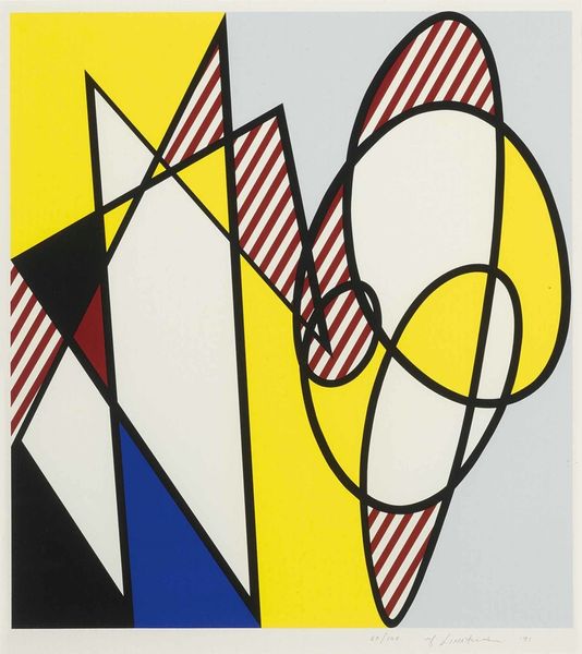 Curator: This print, "Before the Mirror" by Roy Lichtenstein, dates to 1975. It embodies the Pop Art movement. Editor: Bold, isn't it? Almost aggressively flat. The interplay of those primary colours—yellow, blue, black, white—really snaps the composition into focus, yet distorts it at the same time. It’s a still life, but not really. Curator: The interesting thing is, it engages in a dialogue with art history itself. The "mirror" isn’t a mirror at all. We see through it to flat patterns and geometric forms that reference cubism and the modern obsession with mechanical reproduction. Editor: Absolutely. Lichtenstein reduces the still life to graphic elements—stark lines, solid fields of colour, Ben-Day dots that imply volume but are ultimately flat. The texture becomes surface, deliberately undermining any illusionistic depth. It's very self-aware. Curator: And that awareness comments on how mass media images began to be consumed at that time, and their relationship to the consumer. The simplification almost mirrors how images can lose complexity through the consumption and reproduction in magazines and commercial advertisements. Editor: You know, the flattening also emphasizes the artificiality, the manufactured nature of the scene. The choice of basic geometric forms – it recalls the work of artists who explored the essence of form and the mechanics of representation. Stripped bare, these are glasses of water and fruit transformed into pure visual stimulus. Curator: I see it connecting more directly to larger cultural shifts during the '70s—questioning originality, embracing the manufactured image, exploring how Pop Art both reflected and critiqued a society increasingly defined by consumer culture. It made viewers consider the image making enterprise they were becoming reliant on. Editor: Fair enough, although to me it's most engaging as a study of pictorial mechanics, or should I say, mechanics of pictures. It pulls you into a dialogue with the image itself. Curator: I agree. By prompting us to rethink our ideas surrounding still life, "Before the Mirror" gives the viewer insight to the growing importance of commodified and consumed visual materials at that time. Editor: Ultimately, this still life, like other works from this series, embodies art stripped to its bones as pure aesthetic. A lasting echo.