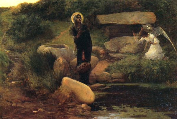 Curator: There’s a palpable tension in this work; the stillness is deceptive. Editor: You're right. We’re looking at John William Waterhouse's "The Naiad," painted in 1893. Immediately striking is the contrast in tone; almost voyeuristic, and yet mournful. Curator: Absolutely. Waterhouse taps into a rich vein of symbolic imagery here. Naiads, in classical mythology, are nymphs of springs and fountains. But they're more than just pretty water sprites; they embody the life force of the water itself. Water, life. And death it seems, given the body lying there. Editor: Contextualizing this in the late 19th century, the male figure prostrate hints at themes of conquest and the feminine mystique gaining more attention, the male as victim. Consider the shift of women in the domestic sphere. Is Waterhouse suggesting some form of environmental consciousness? Curator: Perhaps indirectly. I think Waterhouse is more interested in the inherent mystery of the classical world, viewed through a Victorian lens. Observe how he uses light. It is dappled and creates a sense of being immersed within the scene, mirroring her realm and how connected it is to the woodland's mood. There is a constant motif in Waterhouse's work of the woman as something removed from this sphere. Editor: I would offer an alternate understanding. If Waterhouse seeks the exotic then we have to ask: For whom? During this period, anxieties surrounding class and gender were pervasive. By depicting the Naiad, this otherworldly entity is set up against the modern man as both separate and, literally, above. Curator: But is she “above”? Isn’t there also a hint of vulnerability? She is peering around a tree, almost startled and seems unsure, she could equally represent fragility and be an emblem of nature's precarity in an industrialising age. Editor: I agree there’s fragility, and that the anxiety of modernity surfaces powerfully, but, in some ways, these figures appear as reflections of broader themes circulating throughout the later 19th century and beyond. It's unsettling and captivating. Curator: Indeed. Waterhouse’s work really rewards close and continued looking. Editor: Definitely something to contemplate long after one leaves the gallery.