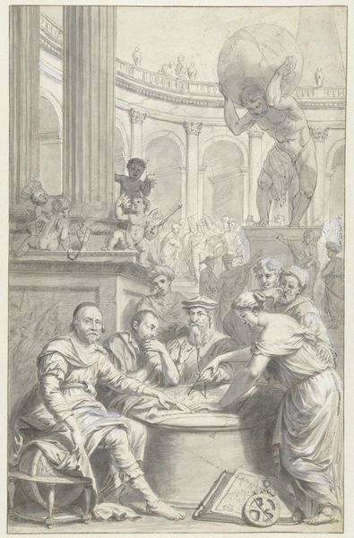 Curator: Hendrick Goltzius created this engraving, "Bruiloft te Kana, blad links," sometime between 1599 and 1603. It depicts a biblical scene, now housed at the Rijksmuseum. Editor: The initial impression is striking – such detailed lines creating this elaborate interior! There is a wonderful interplay between the tight composition of figures at the table versus the more distant details, adding visual intrigue. Curator: Indeed, and think about the context of printmaking at the time. Goltzius wasn't merely illustrating a story, he was participating in a wider printmaking industry. Copies like these served as educational tools, disseminating both religious narratives and artistic styles. Consider too how his workshop production mirrors a larger commercial trade in images, not dissimilar to the globalized exchange we see today. Editor: Absolutely. Notice how he renders textures and light solely through the controlled mark-making. The contrast between dense cross-hatching and open space generates the illusion of depth and volume. The precise lines forming drapery and architectural elements highlight his mastery over form. How is his skill influenced by Baroque, but yet distinct through its attention to details through line? Curator: The social function here can't be dismissed. Depicting a moment of transformation, turning water to wine. Goltzius positions this miracle within a context of lavish dining and social exchange. The act becomes accessible through its tangible representation – food, garments, all mirroring a world both divine and everyday. He used that context of common social practices to translate something inaccessible into an attainable visual reality for wide audiences. Editor: Beyond its illustrative purpose, let's appreciate the sheer compositional audacity. The way Goltzius uses line to define the interior spaces, guiding the eye to the subjects positioned along the arc framing the banquet! Note too how his perspective lines add layers of pictorial interest. Curator: So, by considering materials, commerce, and society's impact upon creation here, we've broadened our lens, right? Editor: Yes! And with its compelling details of spatial rendering in precise form, this engraving represents just a marvelous intersection.