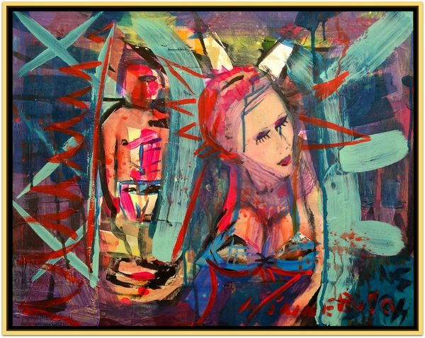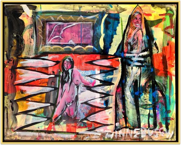 David Michael Hinnebusch created this painting titled “Fairs Fare” using an enigmatic array of shapes and figures. Here, one can observe the prominent figure of a mother, standing tall, a guardian perhaps, overlooking a child. This motif—the protective mother—echoes through time, resonating with the ancient depictions of goddesses like Isis cradling Horus, a symbol of nurturing and safeguarding life. The gesture of open arms above, seemingly reaching out, brings to mind the classical depiction of orants in early Christian art. The image taps into our collective memory, stirring subconscious associations with safety and love. These gestures and forms are never truly new, but resurface, evolve, and take on new meanings, echoing through our shared cultural heritage.