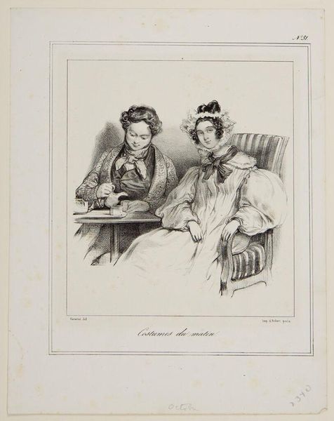 Editor: This is a drawing by Paul Gavarni, titled "Mr. Belassis, I don't have my legs in my coat sleeves." It depicts a child and an adult on a sofa. I find the adult's expression very striking. What do you see in this piece? Curator: Gavarni’s work here, as part of his "Les Enfants Terribles" series, speaks to the societal expectations placed upon children and adults in 19th-century France. The child's assertive statement challenges the rigid power dynamics within the family. It makes us question the adult’s passive role and the child's attempt to subvert those hierarchies. Editor: So, it's a commentary on power? Curator: Exactly. Consider the child's language in the context of increasing industrialization, which changed childhood and gender roles. Gavarni captured the tensions of this historical moment. Editor: That’s a whole new perspective. I didn’t even consider that. Curator: Thinking about the social conditions shifts our understanding, doesn't it? Editor: Definitely. Thanks for pointing that out!