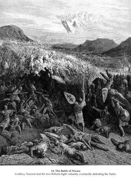 Editor: This is an engraving called "Burying the Dead After the Battle of Dorylaeum," by Gustave Doré. It looks incredibly bleak and overwhelming. So many bodies! What's your take on it? Curator: Overwhelming is the right word! Doré had a knack for capturing the sheer scale of human events, particularly tragic ones. The print fairly screams of desolation, doesn't it? Notice how he contrasts the prone bodies in the foreground with that mass of tiny, almost ant-like figures stretching towards the horizon. What does that contrast evoke for you? Editor: A sense of endlessness, I think. Like the sorrow goes on and on. Also, there's a tent with a cross; that suggests a formal, almost bureaucratic, approach to grief, which feels very strange. Curator: Precisely! It's the institutionalization of mourning amidst absolute chaos. The 'correct' thing to do clashing with the visceral horror of the aftermath. Consider the landscape itself - craggy, inhospitable. Almost like the land is mirroring the event. Doré used light and shadow so dramatically. What do you think the areas of deep shadow are meant to emphasize? Editor: Concealment, maybe? The horror you don't quite see is somehow worse? Or maybe it is about creating the tonal drama... a very baroque approach? Curator: That’s beautifully put! The veiled is often far more terrifying than what is fully exposed. He pulls us in by revealing small pockets of grief, amidst a landscape of muted trauma. He invites us to look deeper. You know, pondering it more, it reminds me how so many depictions of war focus on battles, victory, strategy...Doré focuses solely on what’s *left* after all of that, which feels like the bigger truth, somehow. Editor: Yes, I think I will always see war a little differently after really looking at this.