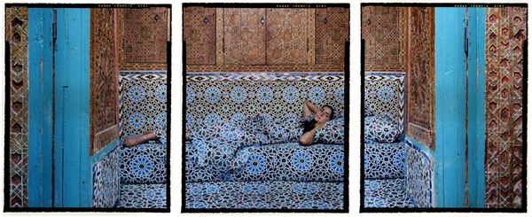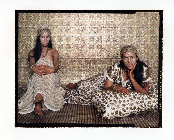 Curator: Today, we’re looking at Lalla Essaydi's "Bullet Revisited #29," a photograph created in 2013. It’s part of a series, so what strikes you initially about this image? Editor: It's shimmering and dreamlike. All that gold, like a modern odalisque, but somehow weighted, laden with…something I can’t quite put my finger on. The flatness, almost two-dimensional. Curator: Yes, Essaydi often works to collapse space, doesn’t she? What about the materials interests you? Think about the layers involved in producing such a richly textured photographic print. Editor: The subject's garments and the setting look encrusted, possibly metallic... What significance do you ascribe to these repeated geometric motifs, that overall application? I mean what is that everywhere? Are those... bullets? Curator: Exactly! That layering and repetition... it’s fascinating how she transforms bullet casings. They are repurposed, meticulously applied, to construct this opulent, decorative scene, almost papering the surfaces of domestic space. Consider the implications, transforming instruments of violence into elements of beauty and constraint. The photographic process captures and mediates this transformation. Editor: Ah, constraint! I was struggling for the right word. There's beauty here, certainly, a visual feast, but also an overwhelming sense of enclosure. That laden feeling is connected to both physical space and the symbols adorning it all. What could that gold symbolize? What do these images speak of with using an actual bullet? Curator: Gold, historically, signified wealth, power, divine status – think about the long tradition of its usage across cultures. Here, it feels almost suffocating, suggesting perhaps, a gilded cage. The bullets themselves take on dual meanings, shifting from representations of conflict to tools for creation and even, ironically, ornamentation. Editor: So the photograph is no longer merely capturing an image, but commenting on the artistic choices by reflecting broader issues of value and transformation itself through her lens. And what of the female figure so central to these opulent trappings? What new interpretation does Essaydi offer to a classical figure, an Islamic Woman perhaps? Curator: It gives one so much to consider, doesn’t it? The complexities inherent in material transformation, cultural symbol, and identity... it encourages a richer, more challenging perspective. Editor: Yes, it prompts a consideration of beauty, history, and even violence... bound together. Fascinating.