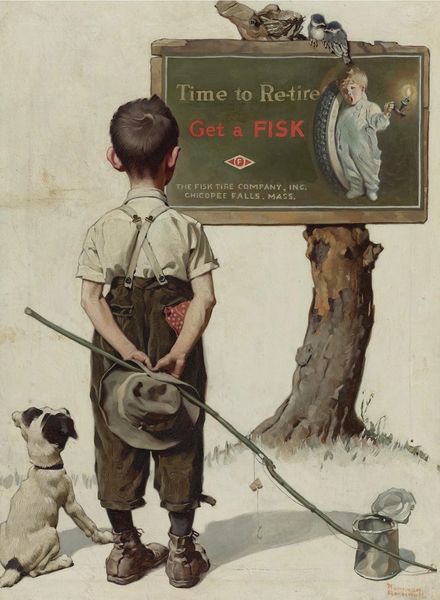 Curator: Let's turn our attention to "The Veterinarian," an oil on canvas completed by Norman Rockwell in 1961. Editor: The first thing that strikes me is the verticality. Rockwell sets up this almost confrontational space using stacked forms to guide our eye between the faces. It's very focused. Curator: Rockwell certainly knew how to guide a narrative. Genre scenes like this always tell a larger story, and the gaze is central. Note how the three figures--veterinarian, boy, dog--all meet with curious intensity. The diploma hanging on the wall legitimizes expertise, and yet everyone seems a little anxious. Editor: Right, there's an immediate tension set up with that contrast. And the palette, even for a realist painter, feels carefully chosen. The background is an unnerving green which seems almost clinical. It draws attention to the texture as well as to the light catching the rounded forms of the figures. Curator: Rockwell uses objects to ground that narrative. The collection of surgical tools hint at the more clinical procedure we cannot quite see but is certainly suggested. I wonder if that almost sinister green references an idealized Americana interrupted by harsher realities of modernity and life changes? Editor: Perhaps, but it is important to note the painting technique; look at how those forms are created, particularly the subtle variation in tone to construct depth, rather than explicit drawing or lines. What it conveys is that Rockwell uses the realistic and mundane to make some other level accessible for his audience, creating not a window into reality, but his idea of it. Curator: Yes, a sense of familiarity permeates this scene—the concerned child, the professional and seemingly gentle veterinarian, and the uncertain dog. They weave a very distinct social narrative we find even today. It speaks to timeless interactions we still hold. Editor: Absolutely. And breaking down those layers of symbolism to study structure shows us why this image resonates, despite all the changing eras in between the painting's time and now.