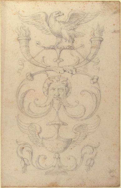 This is a design for sculpted ornament, made with graphite on paper by an anonymous artist. The drawing presents a symmetrical arrangement of stylized botanical motifs, evoking a sense of classical elegance. Images like this were instrumental in shaping the aesthetic landscape of their time. Produced at a time when architecture and decorative arts were intertwined, it reflects the cultural values of formalism and order. Though anonymous, its existence speaks to the institutional systems of artistic production that were emerging: academies, workshops, and pattern books that circulated artistic ideas. Was the artist trained in a formal academy? Did they belong to a particular workshop? Unraveling the social and institutional history of this design requires further investigation: tracing its stylistic origins and considering its potential role in shaping the built environment of its time. Such study allows us to appreciate the cultural forces that shaped artistic creation.