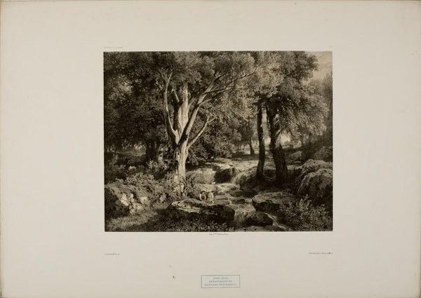 Curator: This is Samuel Birmann's "Landscape with Travelers Watering Their Horses," held here at the Harvard Art Museums. Editor: My first thought is that it's like a dream, a memory of a landscape rather than a real place. Curator: The image centers on an imposing arch, almost Roman in its design, flanked by lush foliage. It is very much an idealized romantic landscape. Editor: Right, nature reclaiming architecture. I see this recurring motif of human endeavor becoming integrated, almost subservient, to the natural world. A commentary on time, maybe? Curator: Perhaps. The watering horses represent a pastoral scene, a moment of pause in a journey, resonating with themes of peace and simplicity. Editor: Makes you wonder where they're going, what stories they carry. Maybe that's the symbol of the open arch, the potential for countless narratives and journeys.
